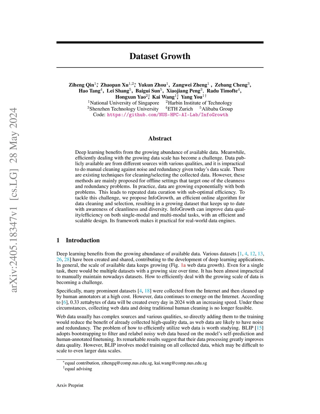 Deep learning benefits from the growing abundance of available data. Meanwhile, efficiently dealing with the growing data scale has become a challenge. Data publicly available are from different sources with various qualities, and it is impractical to do manual cleaning against noise and redundancy given today's data scale. There are existing techniques for cleaning/selecting the collected data. However, these methods are mainly proposed for offline settings that target one of the cleanness and redundancy problems. In practice, data are growing exponentially with both problems. This leads to repeated data curation with sub-optimal efficiency. To tackle this challenge, we propose InfoGrowth, an efficient online algorithm for data cleaning and selection, resulting in a growing dataset that keeps up to date with awareness of cleanliness and diversity. InfoGrowth can improve data quality/efficiency on both single-modal and multi-modal tasks, with an efficient and scalable design. Its framework makes it practical for real-world data engines.