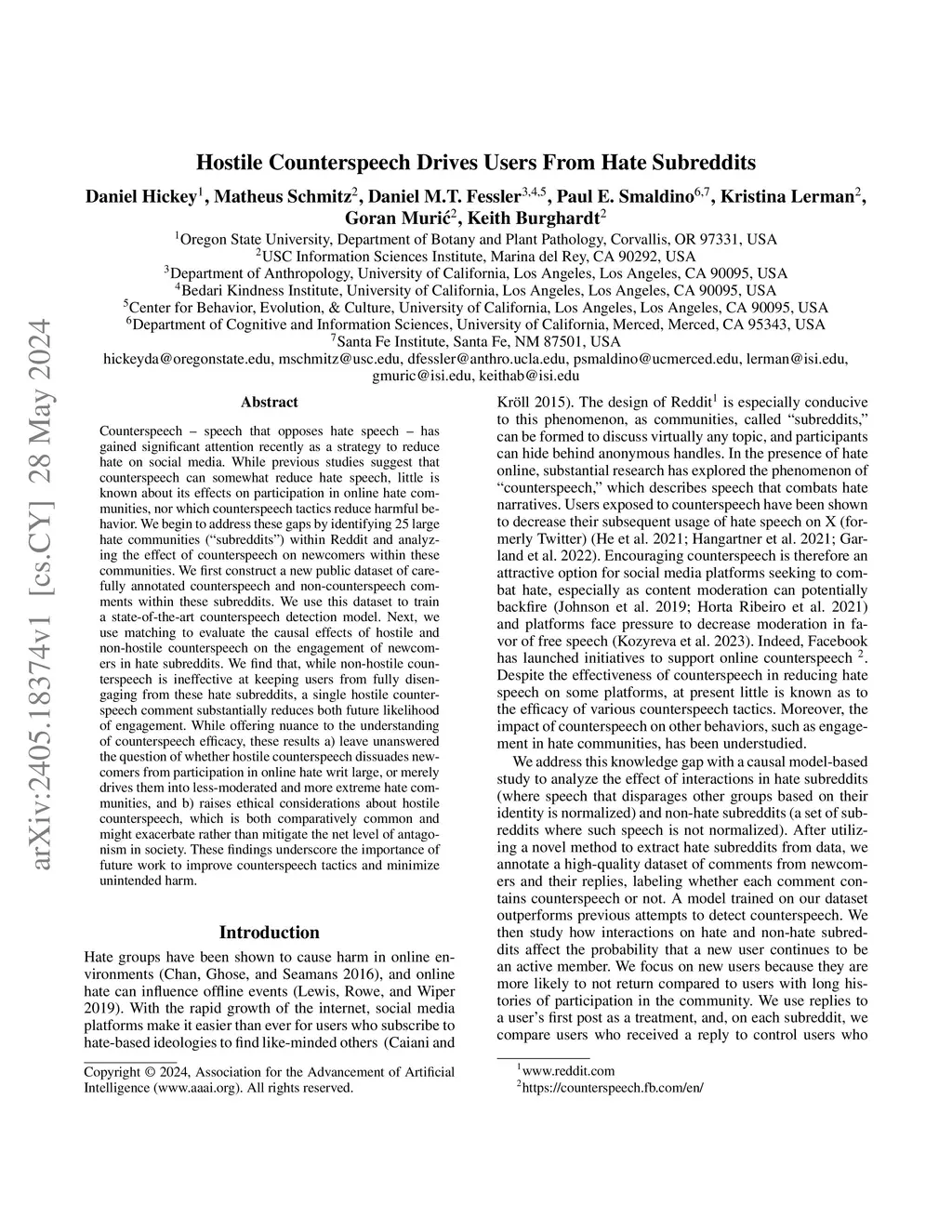 Hostile Counterspeech Drives Users From Hate Subreddits