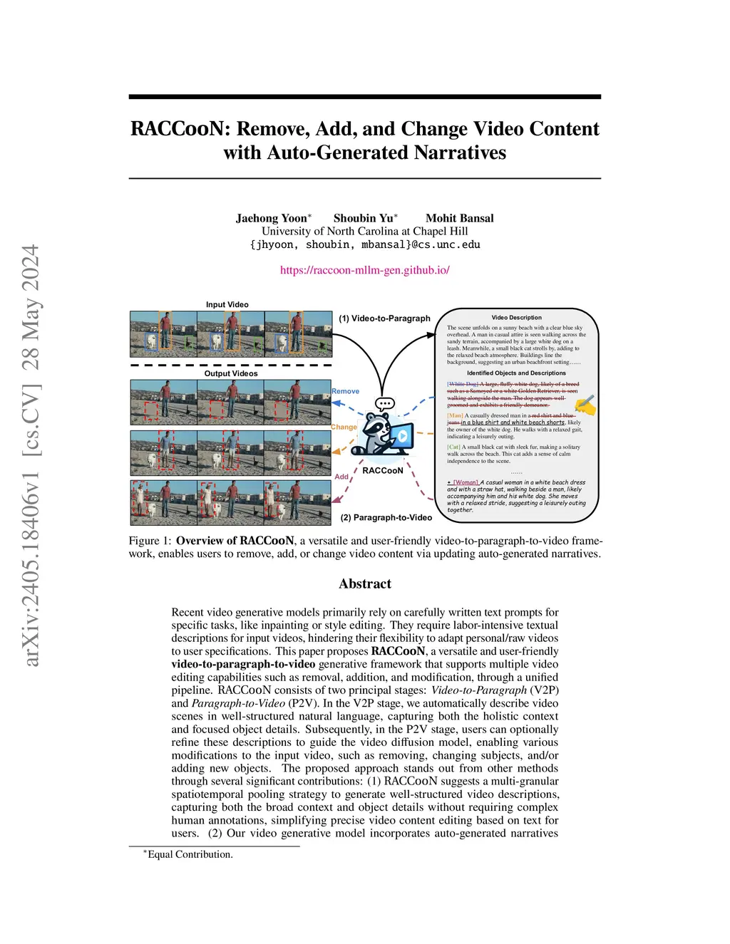 Recent video generative models primarily rely on carefully written text prompts for specific tasks, like inpainting or style editing. They require labor-intensive textual descriptions for input videos, hindering their flexibility to adapt personal/raw videos to user specifications. This paper proposes RACCooN, a versatile and user-friendly video-to-paragraph-to-video generative framework that supports multiple video editing capabilities such as removal, addition, and modification, through a unified pipeline. RACCooN consists of two principal stages: Video-to-Paragraph (V2P) and Paragraph-to-Video (P2V). In the V2P stage, we automatically describe video scenes in well-structured natural language, capturing both the holistic context and focused object details. Subsequently, in the P2V stage, users can optionally refine these descriptions to guide the video diffusion model, enabling various modifications to the input video, such as removing, changing subjects, and/or adding new objects. The proposed approach stands out from other methods through several significant contributions: (1) RACCooN suggests a multi-granular spatiotemporal pooling strategy to generate well-structured video descriptions, capturing both the broad context and object details without requiring complex human annotations, simplifying precise video content editing based on text for users. (2) Our video generative model incorporates auto-generated narratives or instructions to enhance the quality and accuracy of the generated content. (3) RACCooN also plans to imagine new objects in a given video, so users simply prompt the model to receive a detailed video editing plan for complex video editing. The proposed framework demonstrates impressive versatile capabilities in video-to-paragraph generation, video content editing, and can be incorporated into other SoTA video generative models for further enhancement.
