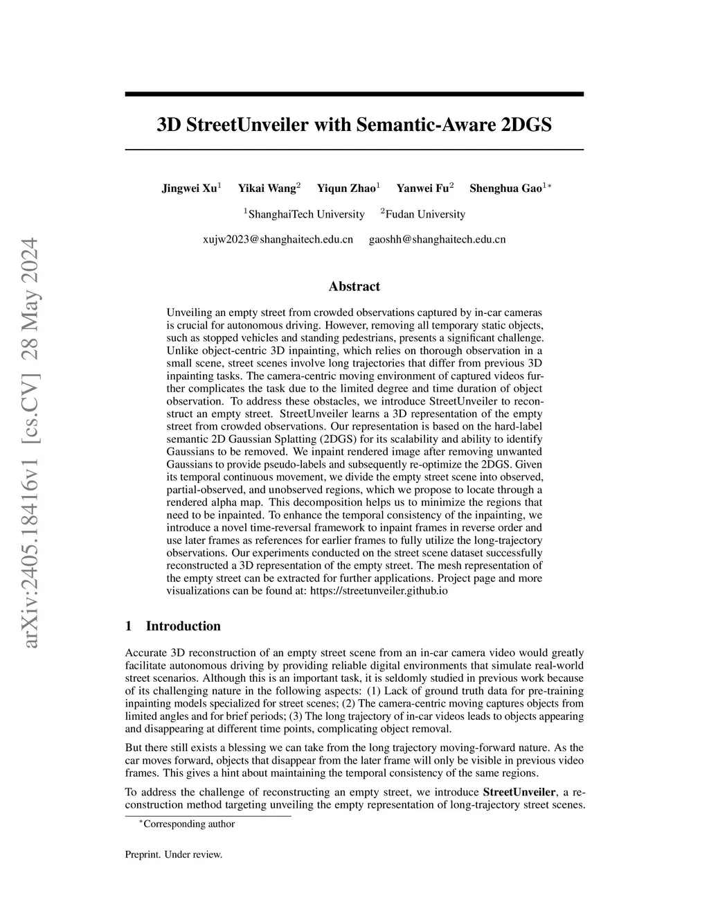 Unveiling an empty street from crowded observations captured by in-car cameras is crucial for autonomous driving. However, removing all temporarily static objects, such as stopped vehicles and standing pedestrians, presents a significant challenge. Unlike object-centric 3D inpainting, which relies on thorough observation in a small scene, street scene cases involve long trajectories that differ from previous 3D inpainting tasks. The camera-centric moving environment of captured videos further complicates the task due to the limited degree and time duration of object observation. To address these obstacles, we introduce StreetUnveiler to reconstruct an empty street. StreetUnveiler learns a 3D representation of the empty street from crowded observations. Our representation is based on the hard-label semantic 2D Gaussian Splatting (2DGS) for its scalability and ability to identify Gaussians to be removed. We inpaint rendered image after removing unwanted Gaussians to provide pseudo-labels and subsequently re-optimize the 2DGS. Given its temporal continuous movement, we divide the empty street scene into observed, partial-observed, and unobserved regions, which we propose to locate through a rendered alpha map. This decomposition helps us to minimize the regions that need to be inpainted. To enhance the temporal consistency of the inpainting, we introduce a novel time-reversal framework to inpaint frames in reverse order and use later frames as references for earlier frames to fully utilize the long-trajectory observations. Our experiments conducted on the street scene dataset successfully reconstructed a 3D representation of the empty street. The mesh representation of the empty street can be extracted for further applications. The project page and more visualizations can be found at:this https URL