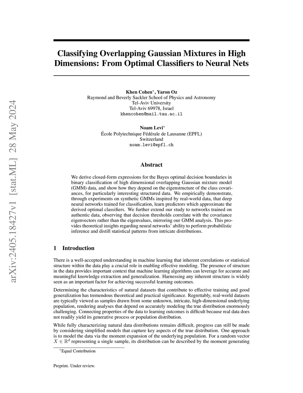 We derive closed-form expressions for the Bayes optimal decision boundaries in binary classification of high dimensional overlapping Gaussian mixture model (GMM) data, and show how they depend on the eigenstructure of the class covariances, for particularly interesting structured data. We empirically demonstrate, through experiments on synthetic GMMs inspired by real-world data, that deep neural networks trained for classification, learn predictors which approximate the derived optimal classifiers. We further extend our study to networks trained on authentic data, observing that decision thresholds correlate with the covariance eigenvectors rather than the eigenvalues, mirroring our GMM analysis. This provides theoretical insights regarding neural networks' ability to perform probabilistic inference and distill statistical patterns from intricate distributions.
