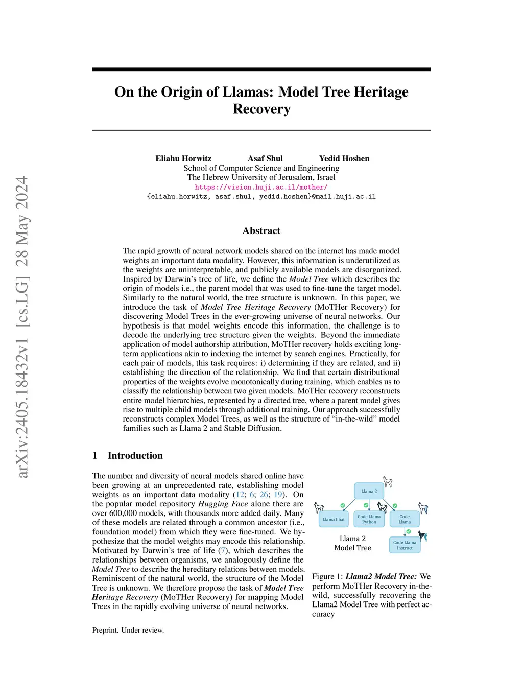 The number of models shared online has recently skyrocketed, with over one million public models available on Hugging Face. Sharing models allows other users to build on existing models, using them as initialization for fine-tuning, improving accuracy, and saving compute and energy. However, it also raises important intellectual property issues, as fine-tuning may violate the license terms of the original model or that of its training data. A Model Tree, i.e., a tree data structure rooted at a foundation model and having directed edges between a parent model and other models directly fine-tuned from it (children), would settle such disputes by making the model heritage explicit. Unfortunately, current models are not well documented, with most model metadata (e.g., "model cards") not providing accurate information about heritage. In this paper, we introduce the task of Unsupervised Model Tree Heritage Recovery (Unsupervised MoTHer Recovery) for collections of neural networks. For each pair of models, this task requires: i) determining if they are directly related, and ii) establishing the direction of the relationship. Our hypothesis is that model weights encode this information, the challenge is to decode the underlying tree structure given the weights. We discover several properties of model weights that allow us to perform this task. By using these properties, we formulate the MoTHer Recovery task as finding a directed minimal spanning tree. In extensive experiments we demonstrate that our method successfully reconstructs complex Model Trees.