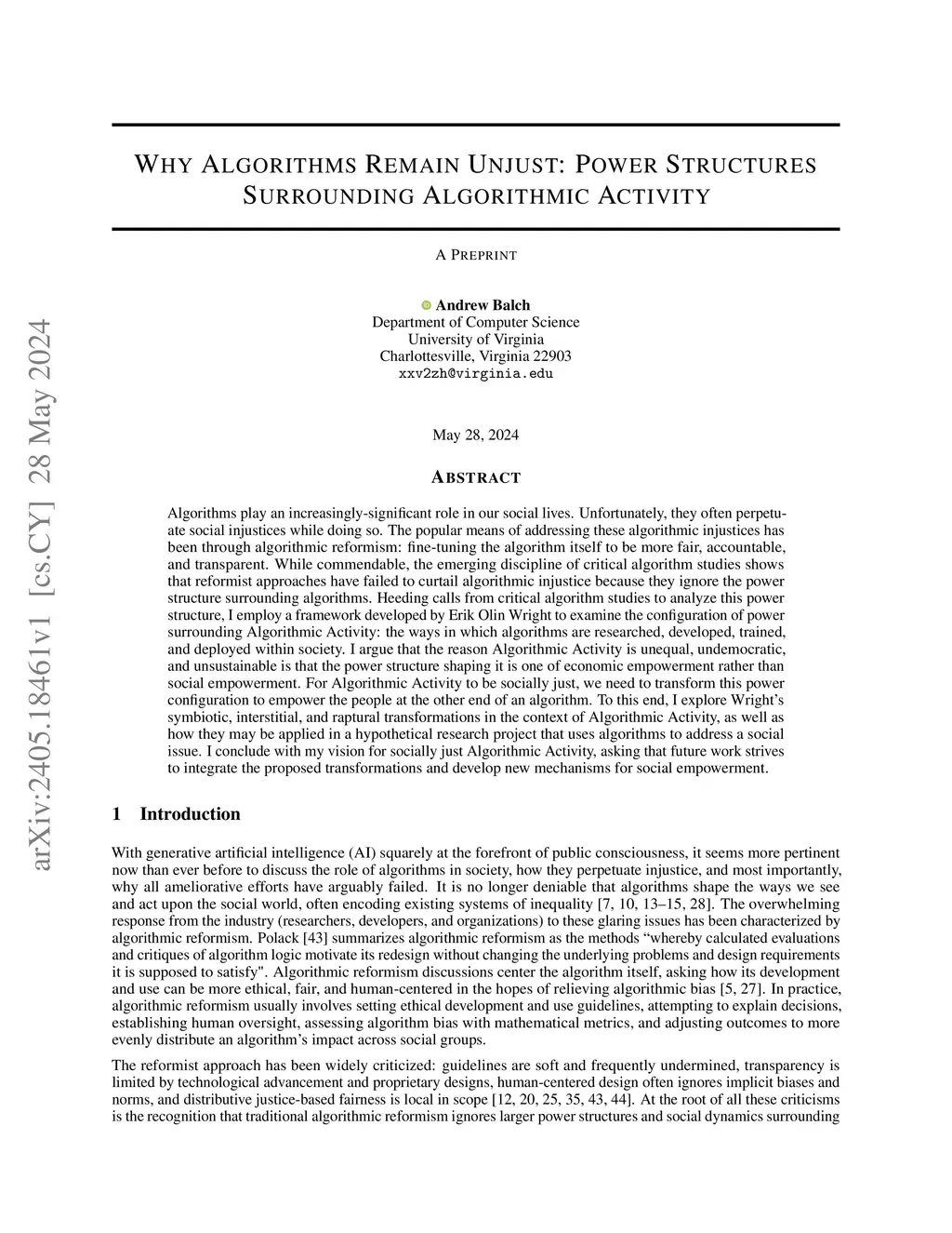 Algorithms play an increasingly-significant role in our social lives. Unfortunately, they often perpetuate social injustices while doing so. The popular means of addressing these algorithmic injustices has been through algorithmic reformism: fine-tuning the algorithm itself to be more fair, accountable, and transparent. While commendable, the emerging discipline of critical algorithm studies shows that reformist approaches have failed to curtail algorithmic injustice because they ignore the power structure surrounding algorithms. Heeding calls from critical algorithm studies to analyze this power structure, I employ a framework developed by Erik Olin Wright to examine the configuration of power surrounding Algorithmic Activity: the ways in which algorithms are researched, developed, trained, and deployed within society. I argue that the reason Algorithmic Activity is unequal, undemocratic, and unsustainable is that the power structure shaping it is one of economic empowerment rather than social empowerment. For Algorithmic Activity to be socially just, we need to transform this power configuration to empower the people at the other end of an algorithm. To this end, I explore Wright's symbiotic, interstitial, and raptural transformations in the context of Algorithmic Activity, as well as how they may be applied in a hypothetical research project that uses algorithms to address a social issue. I conclude with my vision for socially just Algorithmic Activity, asking that future work strives to integrate the proposed transformations and develop new mechanisms for social empowerment.