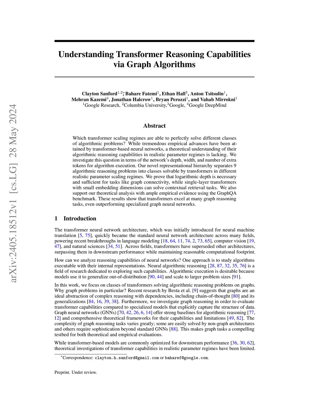Which transformer scaling regimes are able to perfectly solve different classes of algorithmic problems? While tremendous empirical advances have been attained by transformer-based neural networks, a theoretical understanding of their algorithmic reasoning capabilities in realistic parameter regimes is lacking. We investigate this question in terms of the network's depth, width, and number of extra tokens for algorithm execution. Our novel representational hierarchy separates 9 algorithmic reasoning problems into classes solvable by transformers in different realistic parameter scaling regimes. We prove that logarithmic depth is necessary and sufficient for tasks like graph connectivity, while single-layer transformers with small embedding dimensions can solve contextual retrieval tasks. We also support our theoretical analysis with ample empirical evidence using the GraphQA benchmark. These results show that transformers excel at many graph reasoning tasks, even outperforming specialized graph neural networks.