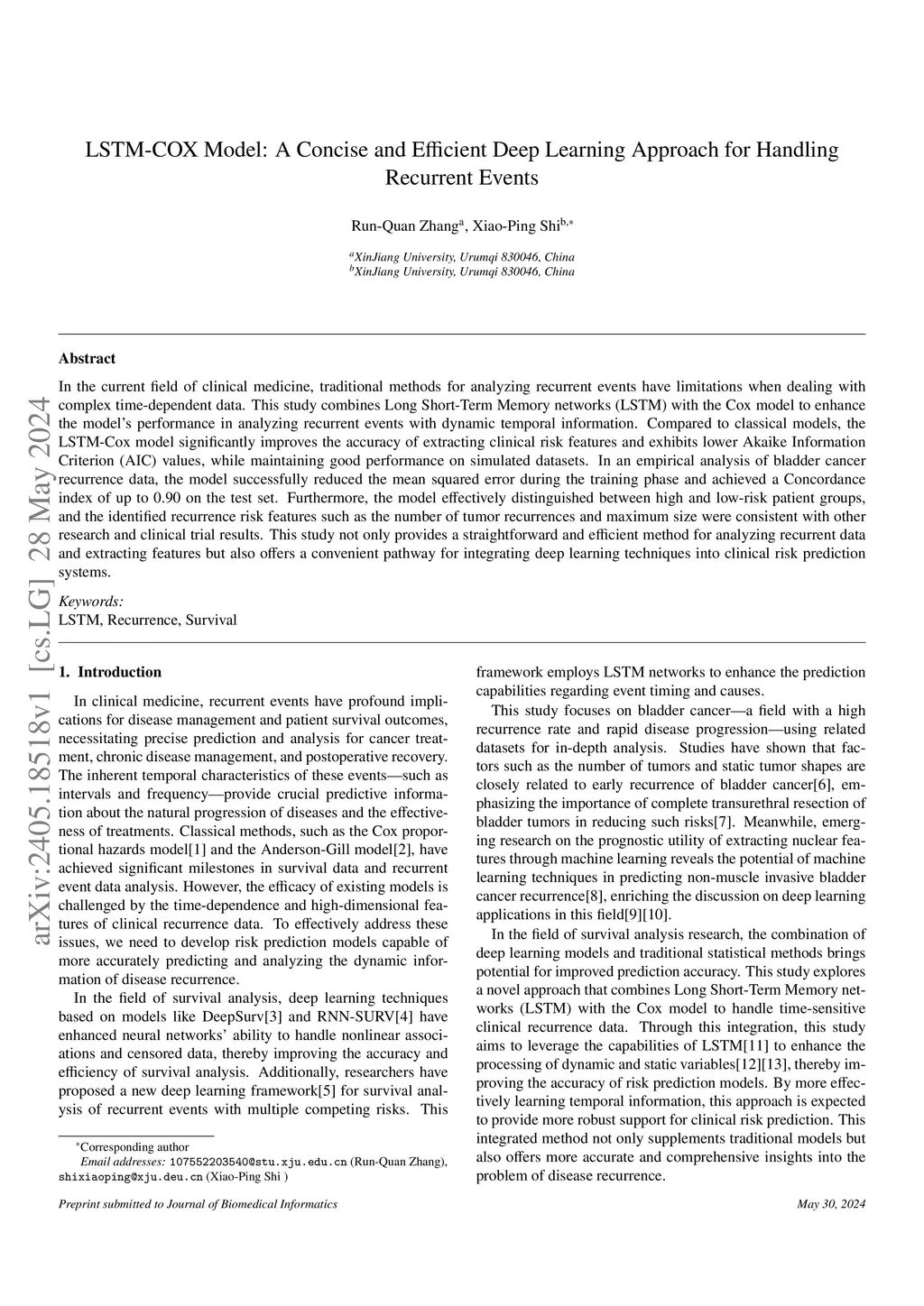 Traditional survival analysis methods often struggle with complex time-dependent data,failing to capture and interpret dynamic characteristics adequately.This study aims to evaluate the performance of three long-sequence models,LSTM,Transformer,and Mamba,in analyzing recurrence event data and integrating them with the Cox proportional hazards model.This study integrates the advantages of deep learning models for handling long-sequence data with the Cox proportional hazards model to enhance the performance in analyzing recurrent events with dynamic time information.Additionally,this study compares the ability of different models to extract and utilize features from time-dependent clinical recurrence data.The LSTM-Cox model outperformed both the Transformer-Cox and Mamba-Cox models in prediction accuracy and model fit,achieving a Concordance index of up to 0.90 on the test set.Significant predictors of bladder cancer recurrence,such as treatment stop time,maximum tumor size at recurrence and recurrence frequency,were identified.The LSTM-Cox model aligned well with clinical outcomes,effectively distinguishing between high-risk and low-risk patient groups.This study demonstrates that the LSTM-Cox model is a robust and efficient method for recurrent data analysis and feature extraction,surpassing newer models like Transformer and Mamba.It offers a practical approach for integrating deep learning technologies into clinical risk prediction systems,thereby improving patient management and treatment outcomes.