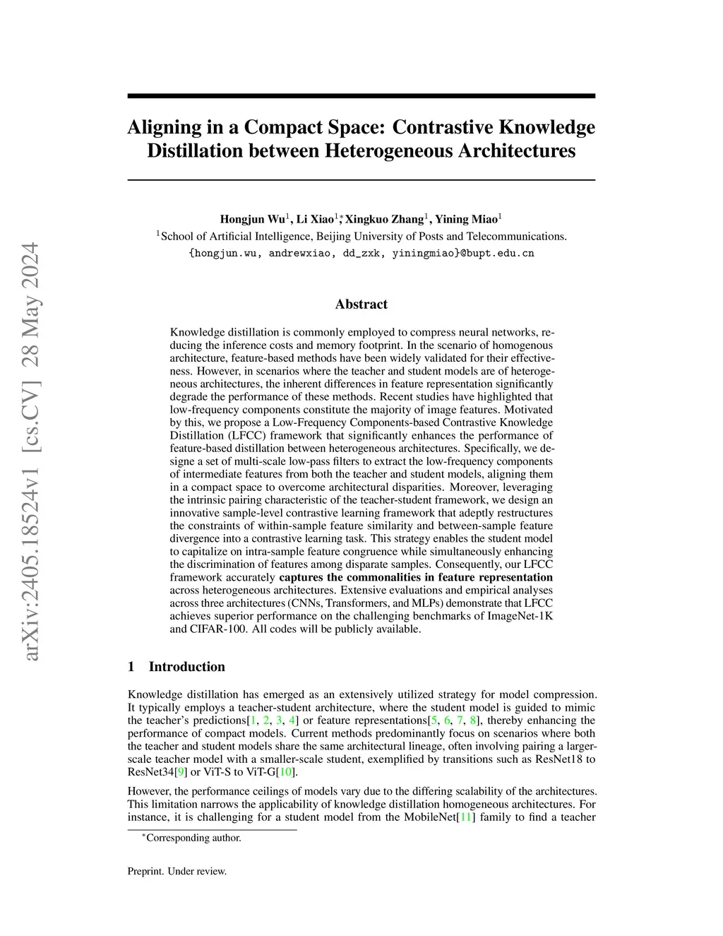 Knowledge distillation is commonly employed to compress neural networks, reducing the inference costs and memory footprint. In the scenario of homogenous architecture, feature-based methods have been widely validated for their effectiveness. However, in scenarios where the teacher and student models are of heterogeneous architectures, the inherent differences in feature representation significantly degrade the performance of these methods. Recent studies have highlighted that low-frequency components constitute the majority of image features. Motivated by this, we propose a Low-Frequency Components-based Contrastive Knowledge Distillation (LFCC) framework that significantly enhances the performance of feature-based distillation between heterogeneous architectures. Specifically, we designe a set of multi-scale low-pass filters to extract the low-frequency components of intermediate features from both the teacher and student models, aligning them in a compact space to overcome architectural disparities. Moreover, leveraging the intrinsic pairing characteristic of the teacher-student framework, we design an innovative sample-level contrastive learning framework that adeptly restructures the constraints of within-sample feature similarity and between-sample feature divergence into a contrastive learning task. This strategy enables the student model to capitalize on intra-sample feature congruence while simultaneously enhancing the discrimination of features among disparate samples. Consequently, our LFCC framework accurately captures the commonalities in feature representation across heterogeneous architectures. Extensive evaluations and empirical analyses across three architectures (CNNs, Transformers, and MLPs) demonstrate that LFCC achieves superior performance on the challenging benchmarks of ImageNet-1K and CIFAR-100. All codes will be publicly available.