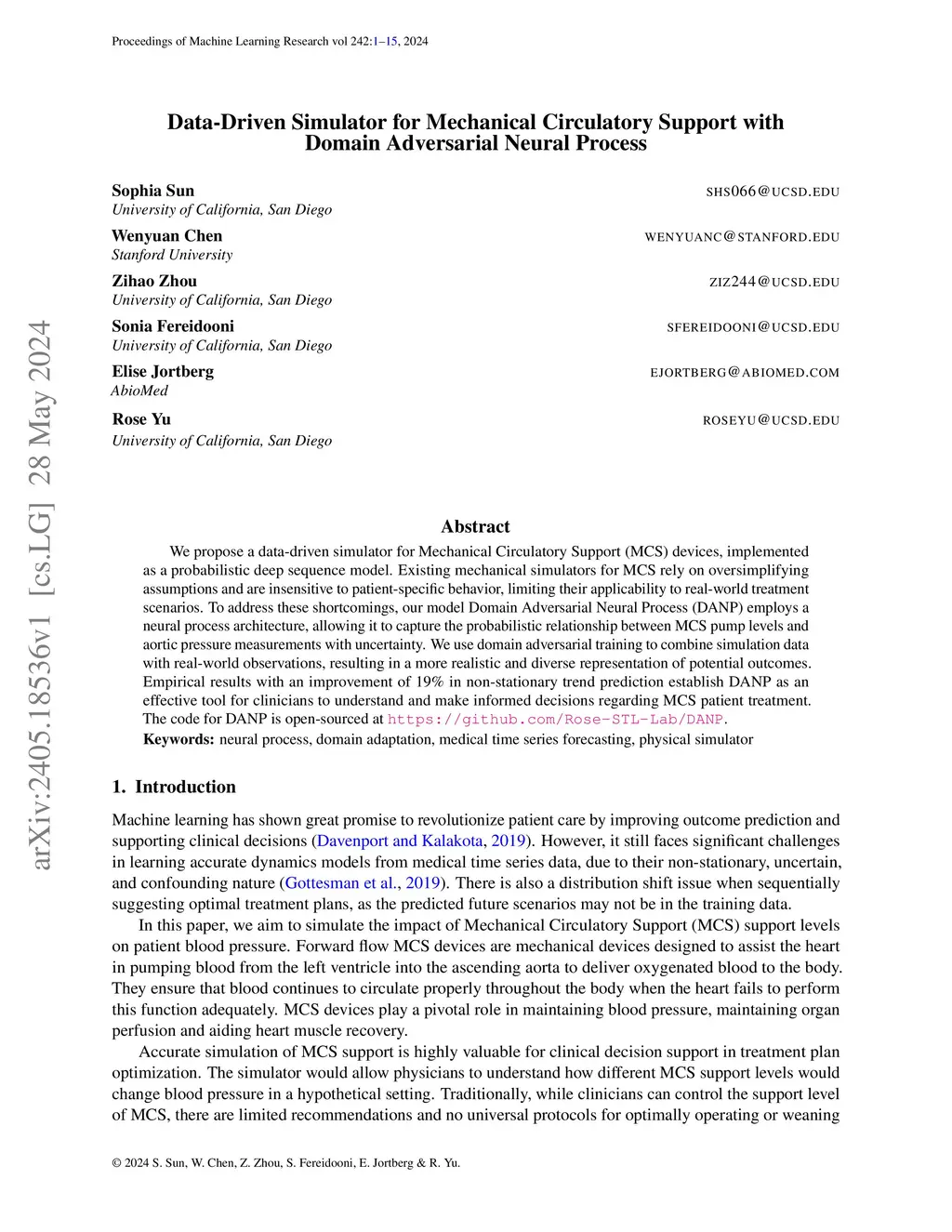 Mechanical Circulatory Support (MCS) devices, implemented as a probabilistic deep sequence model. Existing mechanical simulators for MCS rely on oversimplifying assumptions and are insensitive to patient-specific behavior, limiting their applicability to real-world treatment scenarios. To address these shortcomings, our model Domain Adversarial Neural Process (DANP) employs a neural process architecture, allowing it to capture the probabilistic relationship between MCS pump levels and aortic pressure measurements with uncertainty. We use domain adversarial training to combine simulation data with real-world observations, resulting in a more realistic and diverse representation of potential outcomes. Empirical results with an improvement of 19% in non-stationary trend prediction establish DANP as an effective tool for clinicians to understand and make informed decisions regarding MCS patient treatment.