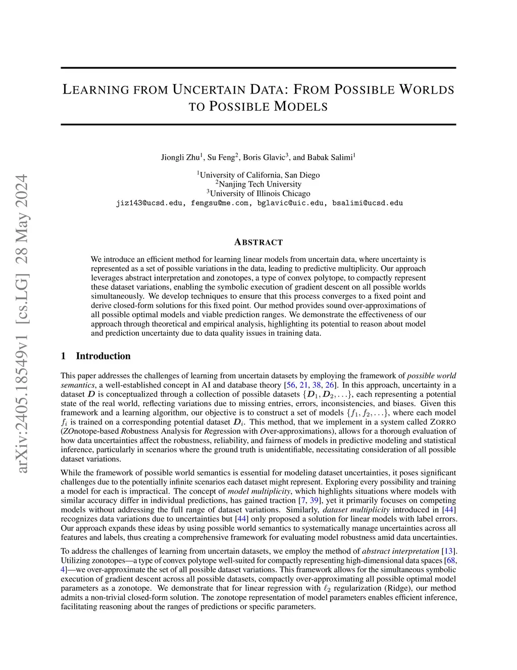 We introduce an efficient method for learning linear models from uncertain data, where uncertainty is represented as a set of possible variations in the data, leading to predictive multiplicity. Our approach leverages abstract interpretation and zonotopes, a type of convex polytope, to compactly represent these dataset variations, enabling the symbolic execution of gradient descent on all possible worlds simultaneously. We develop techniques to ensure that this process converges to a fixed point and derive closed-form solutions for this fixed point. Our method provides sound over-approximations of all possible optimal models and viable prediction ranges. We demonstrate the effectiveness of our approach through theoretical and empirical analysis, highlighting its potential to reason about model and prediction uncertainty due to data quality issues in training data.