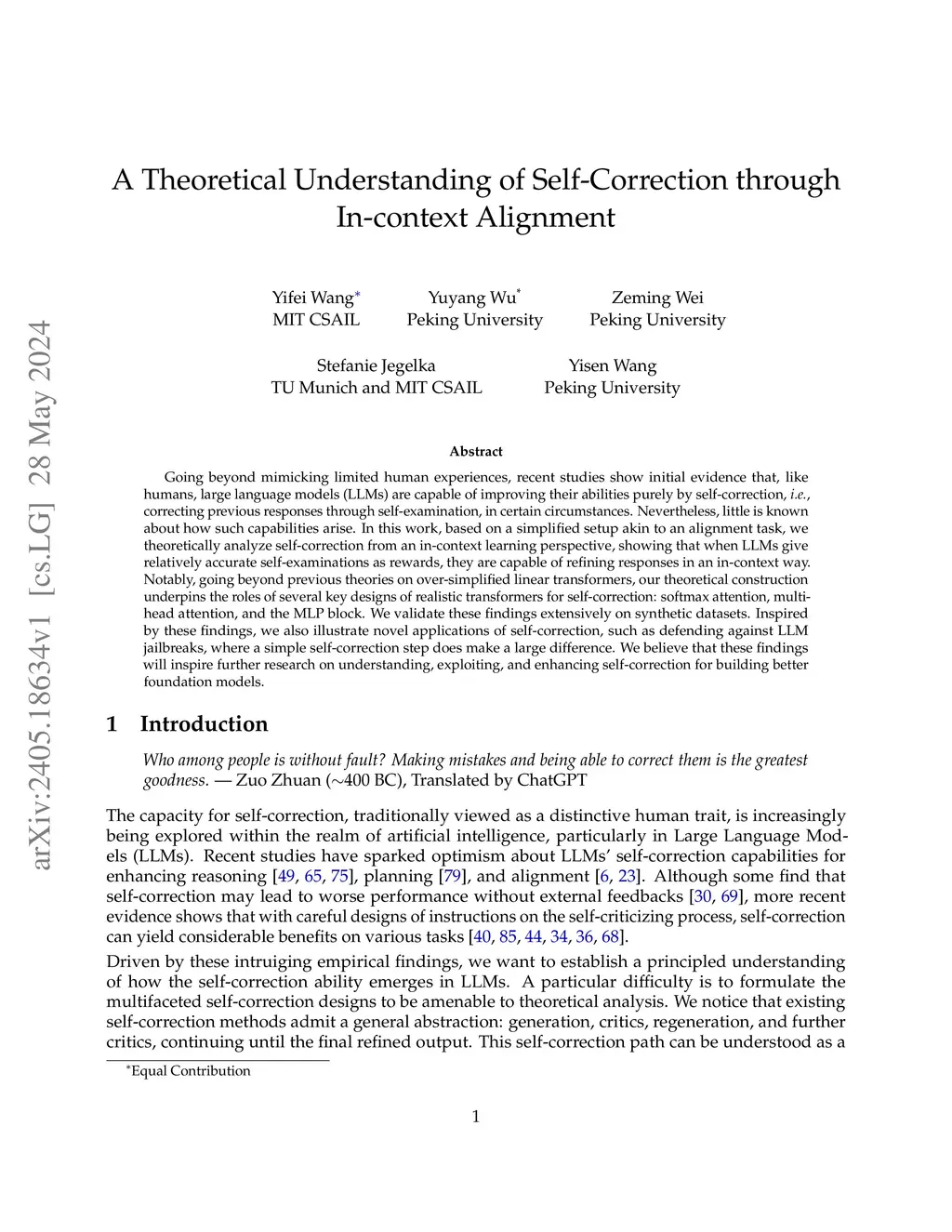 Going beyond mimicking limited human experiences, recent studies show initial evidence that, like humans, large language models (LLMs) are capable of improving their abilities purely by self-correction, i.e., correcting previous responses through self-examination, in certain circumstances. Nevertheless, little is known about how such capabilities arise. In this work, based on a simplified setup akin to an alignment task, we theoretically analyze self-correction from an in-context learning perspective, showing that when LLMs give relatively accurate self-examinations as rewards, they are capable of refining responses in an in-context way. Notably, going beyond previous theories on over-simplified linear transformers, our theoretical construction underpins the roles of several key designs of realistic transformers for self-correction: softmax attention, multi-head attention, and the MLP block. We validate these findings extensively on synthetic datasets. Inspired by these findings, we also illustrate novel applications of self-correction, such as defending against LLM jailbreaks, where a simple self-correction step does make a large difference. We believe that these findings will inspire further research on understanding, exploiting, and enhancing self-correction for building better foundation models.