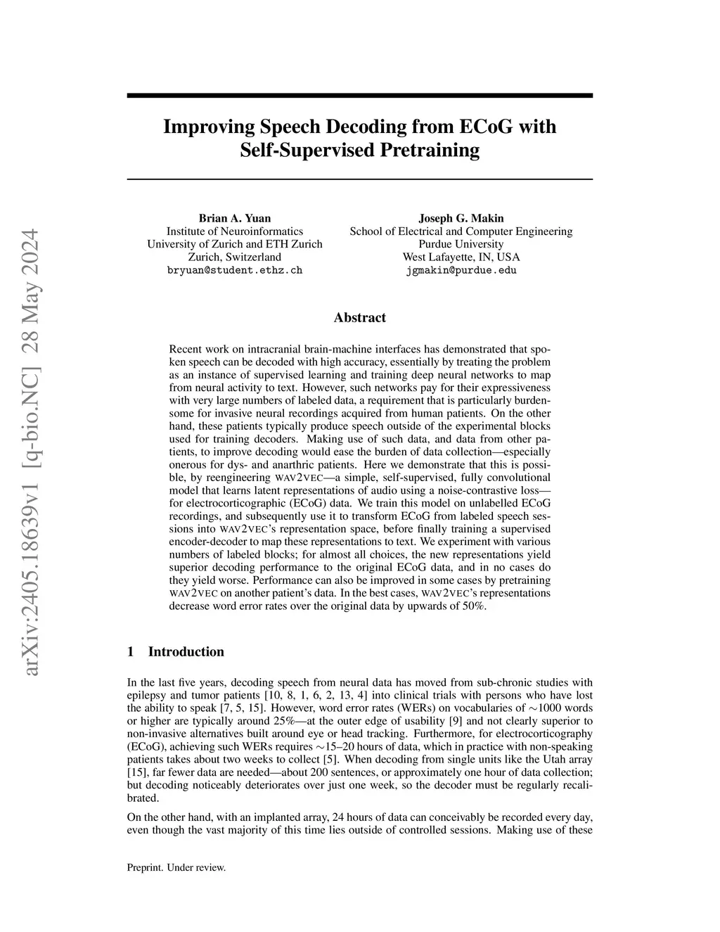 Recent work on intracranial brain-machine interfaces has demonstrated that spoken speech can be decoded with high accuracy, essentially by treating the problem as an instance of supervised learning and training deep neural networks to map from neural activity to text. However, such networks pay for their expressiveness with very large numbers of labeled data, a requirement that is particularly burdensome for invasive neural recordings acquired from human patients. On the other hand, these patients typically produce speech outside of the experimental blocks used for training decoders. Making use of such data, and data from other patients, to improve decoding would ease the burden of data collection -- especially onerous for dys- and anarthric patients. Here we demonstrate that this is possible, by reengineering wav2vec -- a simple, self-supervised, fully convolutional model that learns latent representations of audio using a noise-contrastive loss -- for electrocorticographic (ECoG) data. We train this model on unlabelled ECoG recordings, and subsequently use it to transform ECoG from labeled speech sessions into wav2vec's representation space, before finally training a supervised encoder-decoder to map these representations to text. We experiment with various numbers of labeled blocks; for almost all choices, the new representations yield superior decoding performance to the original ECoG data, and in no cases do they yield worse. Performance can also be improved in some cases by pretraining wav2vec on another patient's data. In the best cases, wav2vec's representations decrease word error rates over the original data by upwards of 50%.