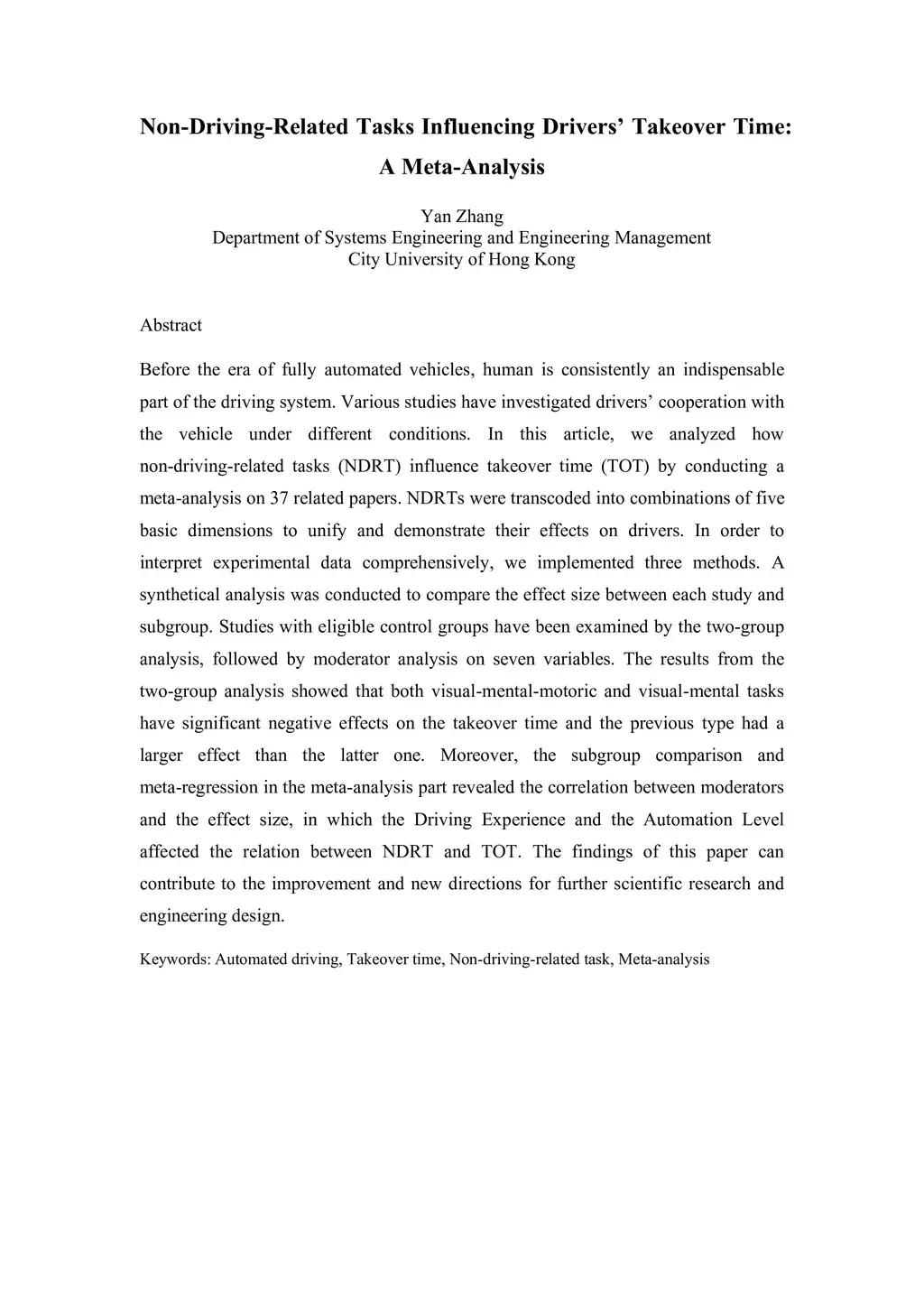 Before the era of fully automated vehicles, human is consistently an indispensable part of the driving system. Various studies have investigated drivers' cooperation with the vehicle under different conditions. In this article, we analyzed how non-driving-related tasks (NDRT) influence takeover time (TOT) by conducting a meta-analysis on 37 related papers. NDRTs were transcoded into combinations of five basic dimensions to unify and demonstrate their effects on drivers. In order to interpret experimental data comprehensively, we implemented three methods. A synthetical analysis was conducted to compare the effect size between each study and subgroup. Studies with eligible control groups have been examined by the two-group analysis, followed by moderator analysis on seven variables. The results from the two-group analysis showed that both visual-mental-motoric and visual-mental tasks have significant negative effects on the takeover time and the previous type had a larger effect than the latter one. Moreover, the subgroup comparison and meta-regression in the meta-analysis part revealed the correlation between moderators and the effect size, in which the Driving Experience and the Automation Level affected the relation between NDRT and TOT. The findings of this paper can contribute to the improvement and new directions for further scientific research and engineering design.