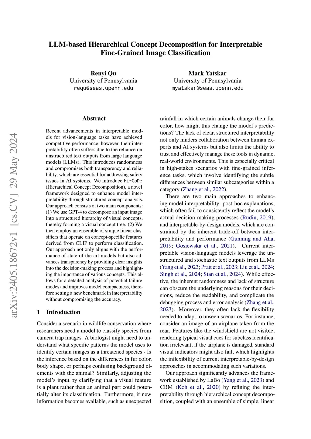 (Renyi Qu's Master's Thesis) Recent advancements in interpretable models for vision-language tasks have achieved competitive performance; however, their interpretability often suffers due to the reliance on unstructured text outputs from large language models (LLMs). This introduces randomness and compromises both transparency and reliability, which are essential for addressing safety issues in AI systems. We introduce \texttt{Hi-CoDe} (Hierarchical Concept Decomposition), a novel framework designed to enhance model interpretability through structured concept analysis. Our approach consists of two main components: (1) We use GPT-4 to decompose an input image into a structured hierarchy of visual concepts, thereby forming a visual concept tree. (2) We then employ an ensemble of simple linear classifiers that operate on concept-specific features derived from CLIP to perform classification. Our approach not only aligns with the performance of state-of-the-art models but also advances transparency by providing clear insights into the decision-making process and highlighting the importance of various concepts. This allows for a detailed analysis of potential failure modes and improves model compactness, therefore setting a new benchmark in interpretability without compromising the accuracy.