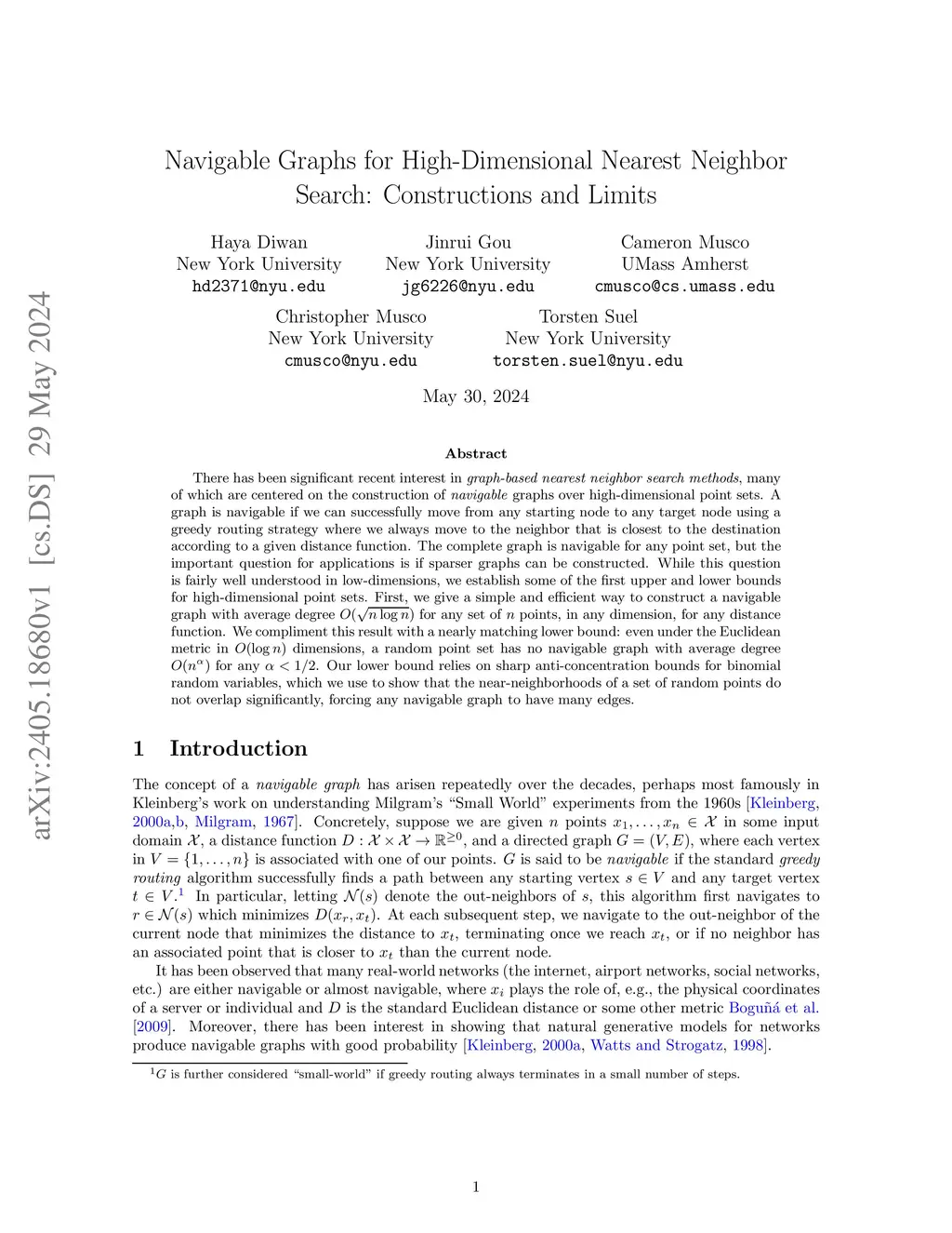 There has been significant recent interest in graph-based nearest neighbor search methods, many of which are centered on the construction of navigable graphs over high-dimensional point sets. A graph is navigable if we can successfully move from any starting node to any target node using a greedy routing strategy where we always move to the neighbor that is closest to the destination according to a given distance function. The complete graph is navigable for any point set, but the important question for applications is if sparser graphs can be constructed. While this question is fairly well understood in low-dimensions, we establish some of the first upper and lower bounds for high-dimensional point sets. First, we give a simple and efficient way to construct a navigable graph with average degree for any set of points, in any dimension, for any distance function. We compliment this result with a nearly matching lower bound: even under the Euclidean metric in dimensions, a random point set has no navigable graph with average degree for any . Our lower bound relies on sharp anti-concentration bounds for binomial random variables, which we use to show that the near-neighborhoods of a set of random points do not overlap significantly, forcing any navigable graph to have many edges.