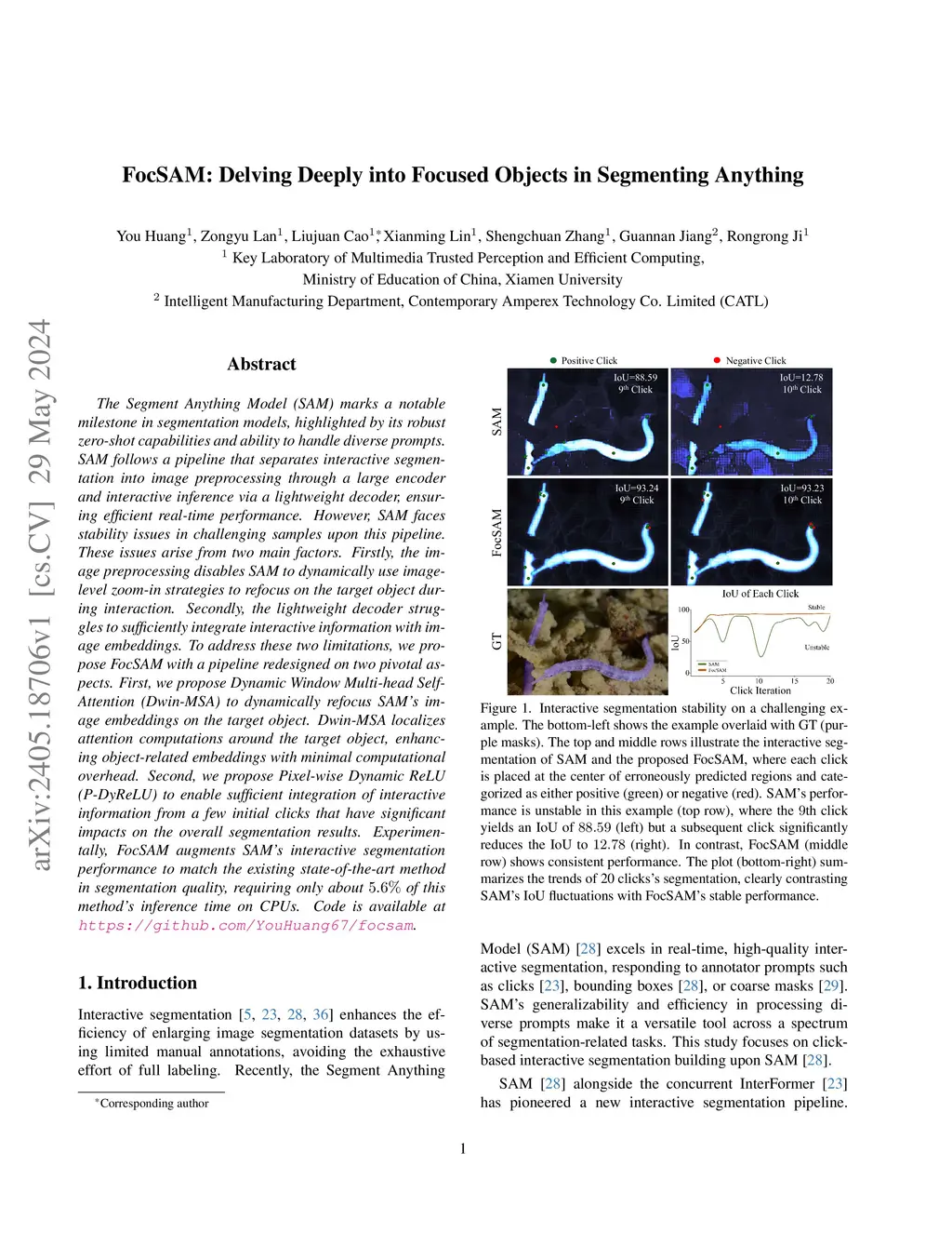 The Segment Anything Model (SAM) marks a notable milestone in segmentation models, highlighted by its robust zero-shot capabilities and ability to handle diverse prompts. SAM follows a pipeline that separates interactive segmentation into image preprocessing through a large encoder and interactive inference via a lightweight decoder, ensuring efficient real-time performance. However, SAM faces stability issues in challenging samples upon this pipeline. These issues arise from two main factors. Firstly, the image preprocessing disables SAM from dynamically using image-level zoom-in strategies to refocus on the target object during interaction. Secondly, the lightweight decoder struggles to sufficiently integrate interactive information with image embeddings. To address these two limitations, we propose FocSAM with a pipeline redesigned on two pivotal aspects. First, we propose Dynamic Window Multi-head Self-Attention (Dwin-MSA) to dynamically refocus SAM's image embeddings on the target object. Dwin-MSA localizes attention computations around the target object, enhancing object-related embeddings with minimal computational overhead. Second, we propose Pixel-wise Dynamic ReLU (P-DyReLU) to enable sufficient integration of interactive information from a few initial clicks that have significant impacts on the overall segmentation results. Experimentally, FocSAM augments SAM's interactive segmentation performance to match the existing state-of-the-art method in segmentation quality, requiring only about 5.6% of this method's inference time on CPUs.