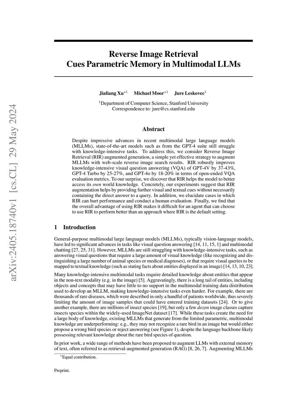 Despite impressive advances in recent multimodal large language models (MLLMs), state-of-the-art models such as from the GPT-4 suite still struggle with knowledge-intensive tasks. To address this, we consider Reverse Image Retrieval (RIR) augmented generation, a simple yet effective strategy to augment MLLMs with web-scale reverse image search results. RIR robustly improves knowledge-intensive visual question answering (VQA) of GPT-4V by 37-43%, GPT-4 Turbo by 25-27%, and GPT-4o by 18-20% in terms of open-ended VQA evaluation metrics. To our surprise, we discover that RIR helps the model to better access its own world knowledge. Concretely, our experiments suggest that RIR augmentation helps by providing further visual and textual cues without necessarily containing the direct answer to a query. In addition, we elucidate cases in which RIR can hurt performance and conduct a human evaluation. Finally, we find that the overall advantage of using RIR makes it difficult for an agent that can choose to use RIR to perform better than an approach where RIR is the default setting.
