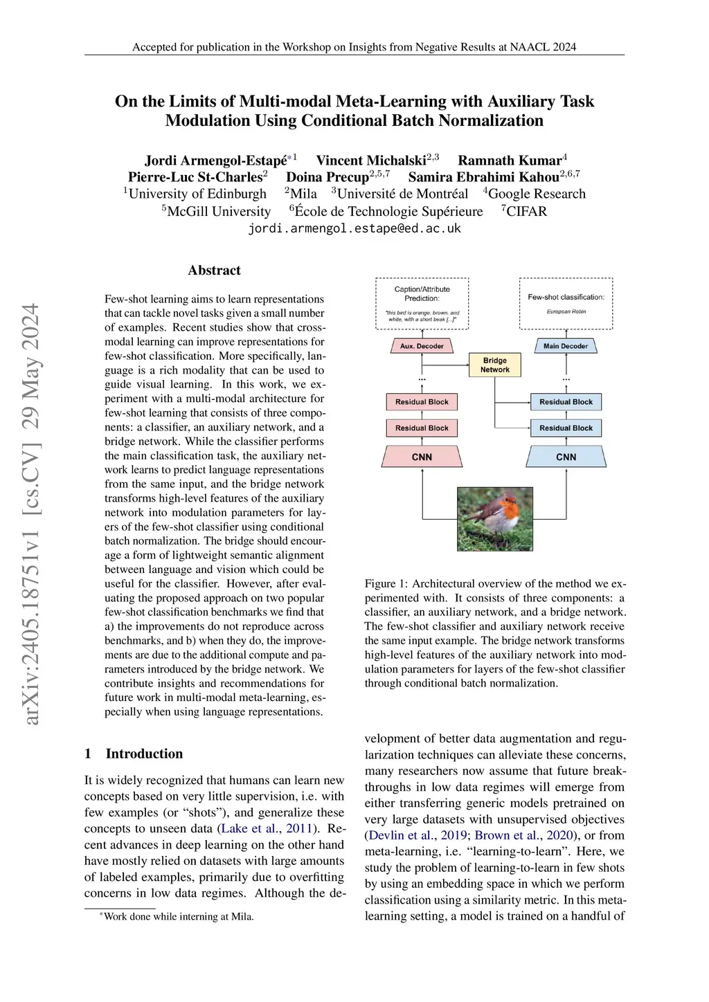 Few-shot learning aims to learn representations that can tackle novel tasks given a small number of examples. Recent studies show that cross-modal learning can improve representations for few-shot classification. More specifically, language is a rich modality that can be used to guide visual learning. In this work, we experiment with a multi-modal architecture for few-shot learning that consists of three components: a classifier, an auxiliary network, and a bridge network. While the classifier performs the main classification task, the auxiliary network learns to predict language representations from the same input, and the bridge network transforms high-level features of the auxiliary network into modulation parameters for layers of the few-shot classifier using conditional batch normalization. The bridge should encourage a form of lightweight semantic alignment between language and vision which could be useful for the classifier. However, after evaluating the proposed approach on two popular few-shot classification benchmarks we find that a) the improvements do not reproduce across benchmarks, and b) when they do, the improvements are due to the additional compute and parameters introduced by the bridge network. We contribute insights and recommendations for future work in multi-modal meta-learning, especially when using language representations.