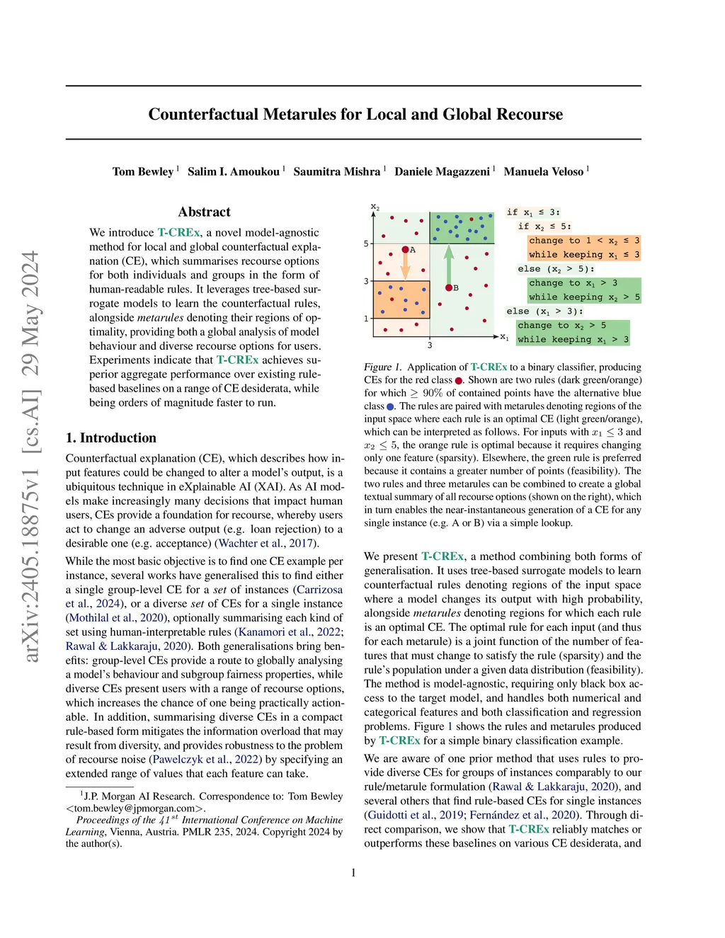 We introduce T-CREx, a novel model-agnostic method for local and global counterfactual explanation (CE), which summarises recourse options for both individuals and groups in the form of human-readable rules. It leverages tree-based surrogate models to learn the counterfactual rules, alongside 'metarules' denoting their regions of optimality, providing both a global analysis of model behaviour and diverse recourse options for users. Experiments indicate that T-CREx achieves superior aggregate performance over existing rule-based baselines on a range of CE desiderata, while being orders of magnitude faster to run.