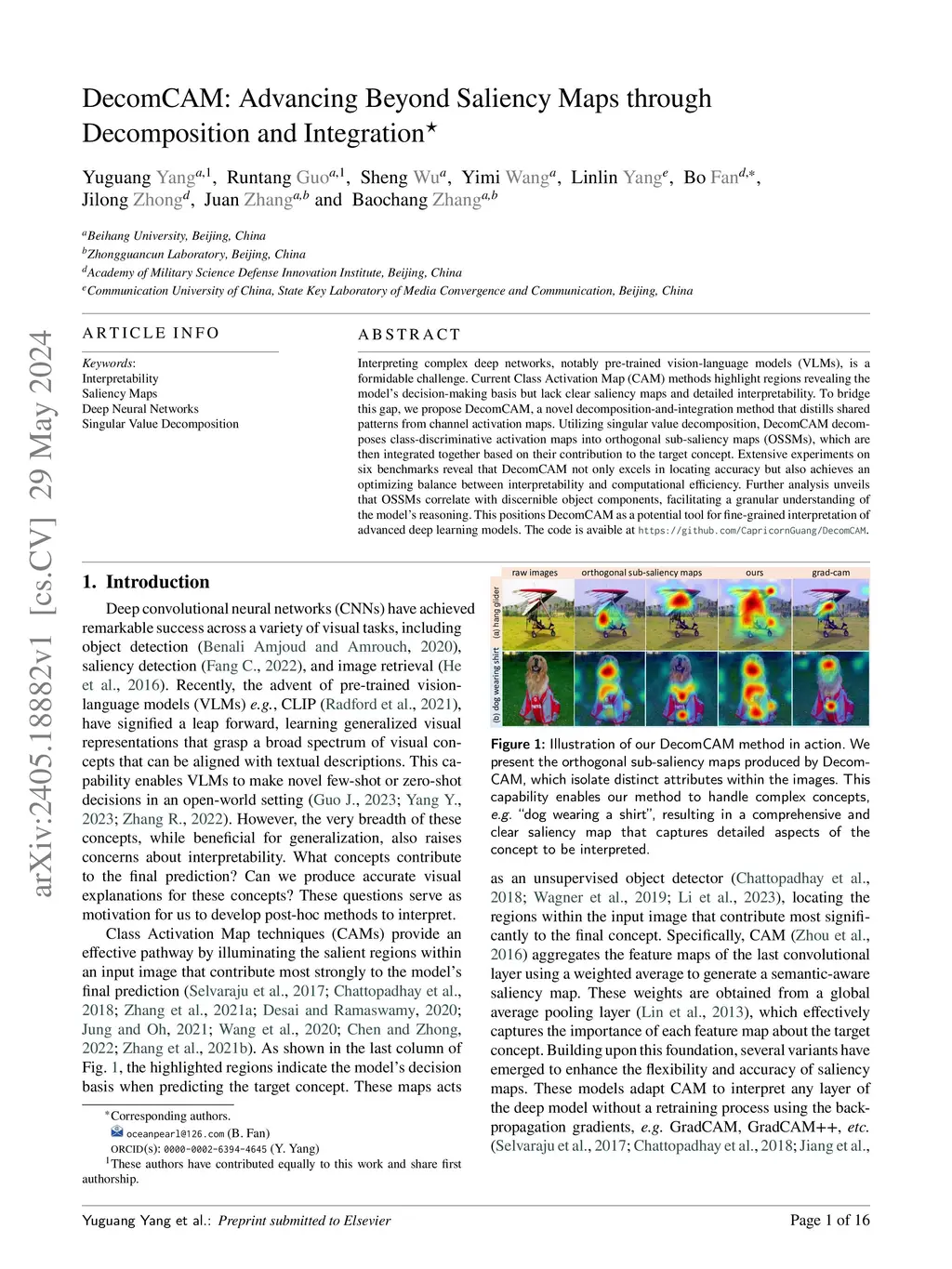 Interpreting complex deep networks, notably pre-trained vision-language models (VLMs), is a formidable challenge. Current Class Activation Map (CAM) methods highlight regions revealing the model's decision-making basis but lack clear saliency maps and detailed interpretability. To bridge this gap, we propose DecomCAM, a novel decomposition-and-integration method that distills shared patterns from channel activation maps. Utilizing singular value decomposition, DecomCAM decomposes class-discriminative activation maps into orthogonal sub-saliency maps (OSSMs), which are then integrated together based on their contribution to the target concept. Extensive experiments on six benchmarks reveal that DecomCAM not only excels in locating accuracy but also achieves an optimizing balance between interpretability and computational efficiency. Further analysis unveils that OSSMs correlate with discernible object components, facilitating a granular understanding of the model's reasoning. This positions DecomCAM as a potential tool for fine-grained interpretation of advanced deep learning models. The code is avaible at https://github.com/CapricornGuang/DecomCAM.