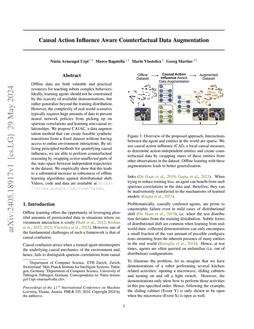 Offline data are both valuable and practical resources for teaching robots complex behaviors. Ideally, learning agents should not be constrained by the scarcity of available demonstrations, but rather generalize beyond the training distribution. However, the complexity of real-world scenarios typically requires huge amounts of data to prevent neural network policies from picking up on spurious correlations and learning non-causal relationships. We propose CAIAC, a data augmentation method that can create feasible synthetic transitions from a fixed dataset without having access to online environment interactions. By utilizing principled methods for quantifying causal influence, we are able to perform counterfactual reasoning by swapping -unaffected parts of the state-space between independent trajectories in the dataset. We empirically show that this leads to a substantial increase in robustness of offline learning algorithms against distributional shift.