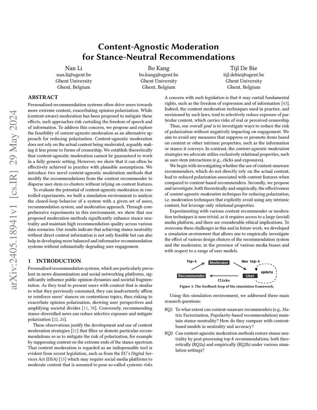 Content-Agnostic Moderation for Stance-Neutral Recommendation
