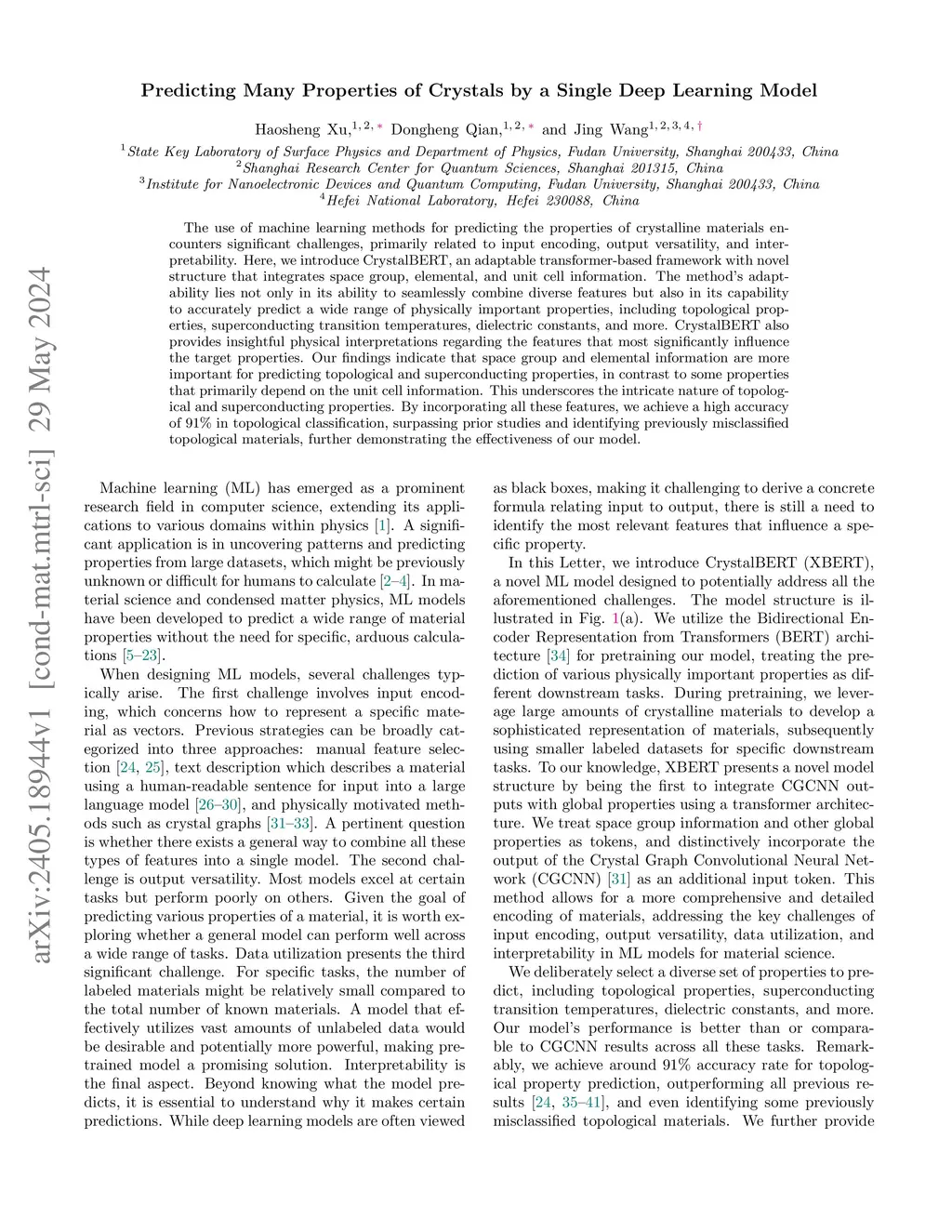 The use of machine learning methods for predicting the properties of crystalline materials encounters significant challenges, primarily related to input encoding, output versatility, and interpretability. Here, we introduce CrystalBERT, an adaptable transformer-based framework with novel structure that integrates space group, elemental, and unit cell information. The method's adaptability lies not only in its ability to seamlessly combine diverse features but also in its capability to accurately predict a wide range of physically important properties, including topological properties, superconducting transition temperatures, dielectric constants, and more. CrystalBERT also provides insightful physical interpretations regarding the features that most significantly influence the target properties. Our findings indicate that space group and elemental information are more important for predicting topological and superconducting properties, in contrast to some properties that primarily depend on the unit cell information. This underscores the intricate nature of topological and superconducting properties. By incorporating all these features, we achieve a high accuracy of 91% in topological classification, surpassing prior studies and identifying previously misclassified topological materials, further demonstrating the effectiveness of our model.