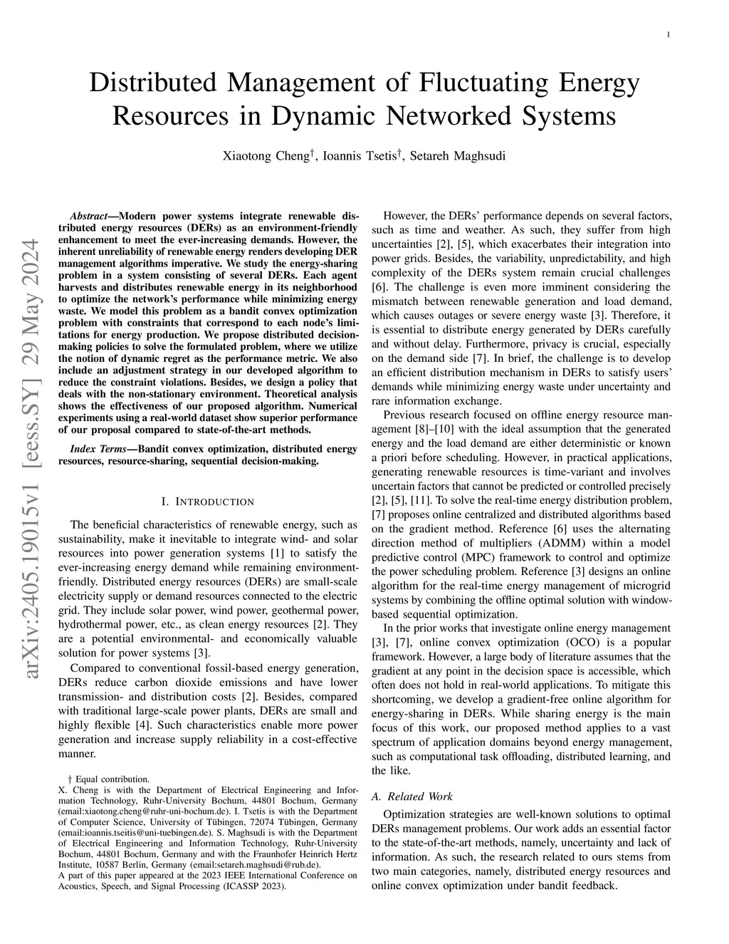 Modern power systems integrate renewable distributed energy resources (DERs) as an environment-friendly enhancement to meet the ever-increasing demands. However, the inherent unreliability of renewable energy renders developing DER management algorithms imperative. We study the energy-sharing problem in a system consisting of several DERs. Each agent harvests and distributes renewable energy in its neighborhood to optimize the network's performance while minimizing energy waste. We model this problem as a bandit convex optimization problem with constraints that correspond to each node's limitations for energy production. We propose distributed decision-making policies to solve the formulated problem, where we utilize the notion of dynamic regret as the performance metric. We also include an adjustment strategy in our developed algorithm to reduce the constraint violations. Besides, we design a policy that deals with the non-stationary environment. Theoretical analysis shows the effectiveness of our proposed algorithm. Numerical experiments using a real-world dataset show superior performance of our proposal compared to state-of-the-art methods.