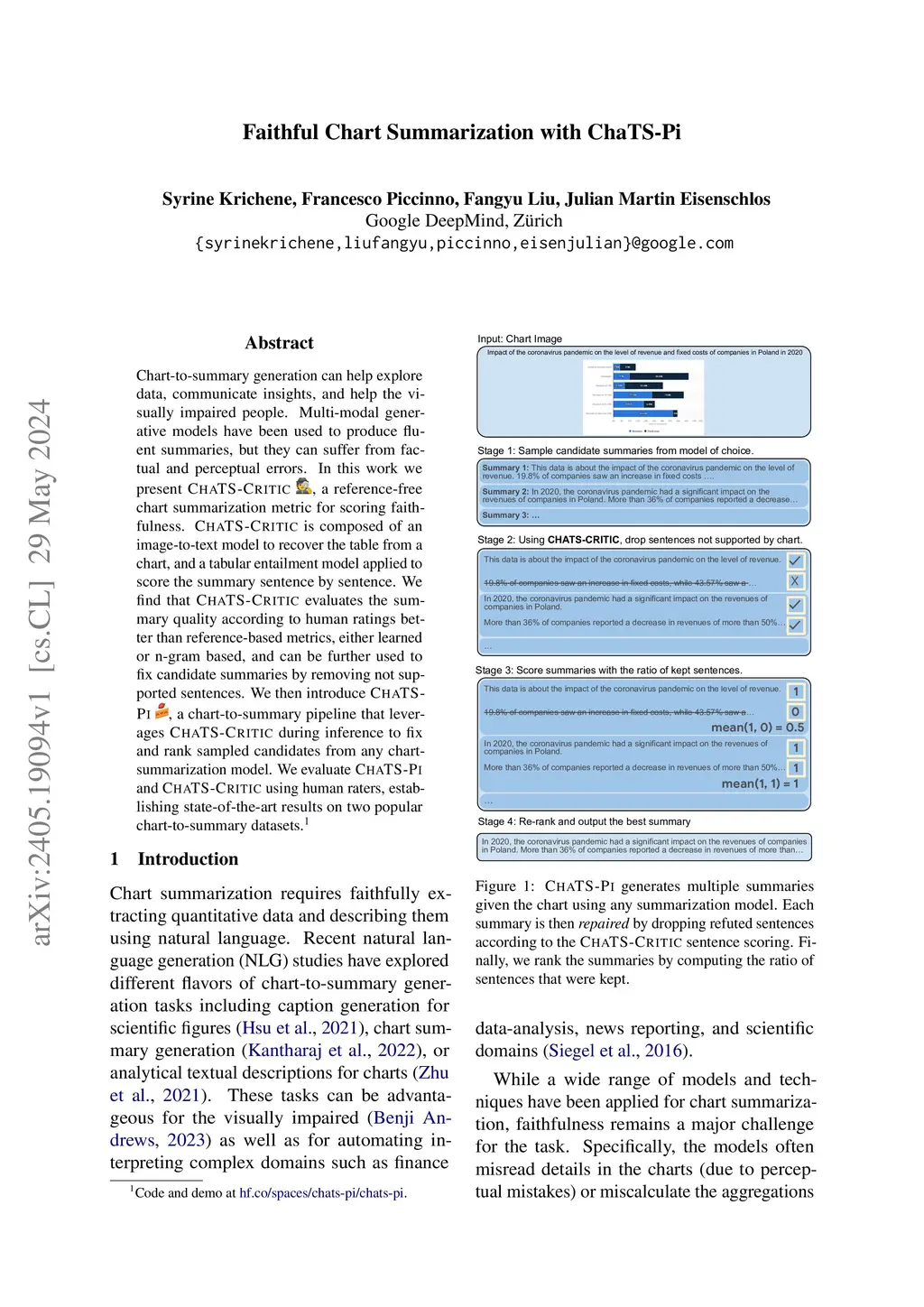 Chart-to-summary generation can help explore data, communicate insights, and help the visually impaired people. Multi-modal generative models have been used to produce fluent summaries, but they can suffer from factual and perceptual errors. In this work we present CHATS-CRITIC, a reference-free chart summarization metric for scoring faithfulness. CHATS-CRITIC is composed of an image-to-text model to recover the table from a chart, and a tabular entailment model applied to score the summary sentence by sentence. We find that CHATS-CRITIC evaluates the summary quality according to human ratings better than reference-based metrics, either learned or n-gram based, and can be further used to fix candidate summaries by removing not supported sentences. We then introduce CHATS-PI, a chart-to-summary pipeline that leverages CHATS-CRITIC during inference to fix and rank sampled candidates from any chart-summarization model. We evaluate CHATS-PI and CHATS-CRITIC using human raters, establishing state-of-the-art results on two popular chart-to-summary datasets.