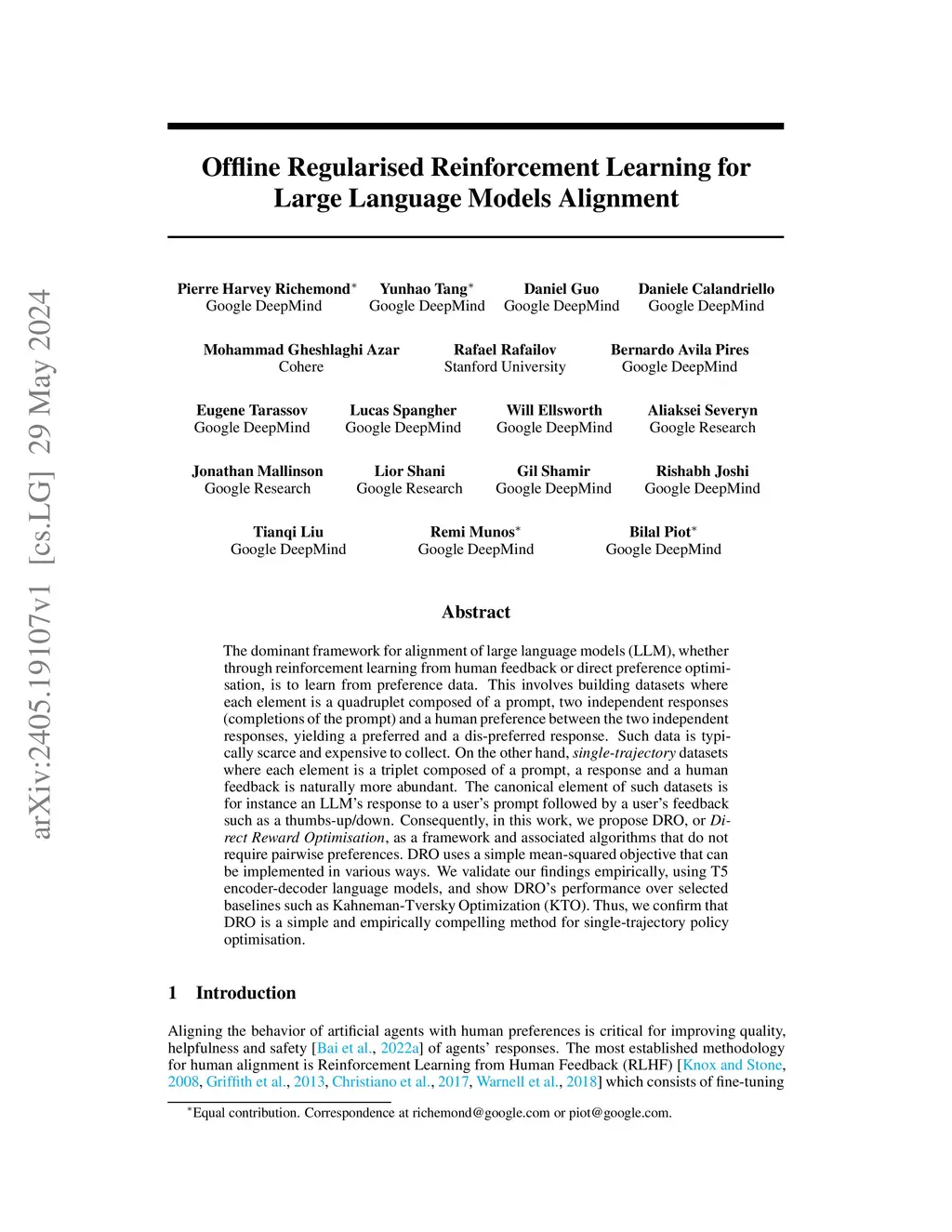 The dominant framework for alignment of large language models (LLM), whether through reinforcement learning from human feedback or direct preference optimisation, is to learn from preference data. This involves building datasets where each element is a quadruplet composed of a prompt, two independent responses (completions of the prompt) and a human preference between the two independent responses, yielding a preferred and a dis-preferred response. Such data is typically scarce and expensive to collect. On the other hand, \emph{single-trajectory} datasets where each element is a triplet composed of a prompt, a response and a human feedback is naturally more abundant. The canonical element of such datasets is for instance an LLM's response to a user's prompt followed by a user's feedback such as a thumbs-up/down. Consequently, in this work, we propose DRO, or \emph{Direct Reward Optimisation}, as a framework and associated algorithms that do not require pairwise preferences. DRO uses a simple mean-squared objective that can be implemented in various ways. We validate our findings empirically, using T5 encoder-decoder language models, and show DRO's performance over selected baselines such as Kahneman-Tversky Optimization (KTO). Thus, we confirm that DRO is a simple and empirically compelling method for single-trajectory policy optimisation.