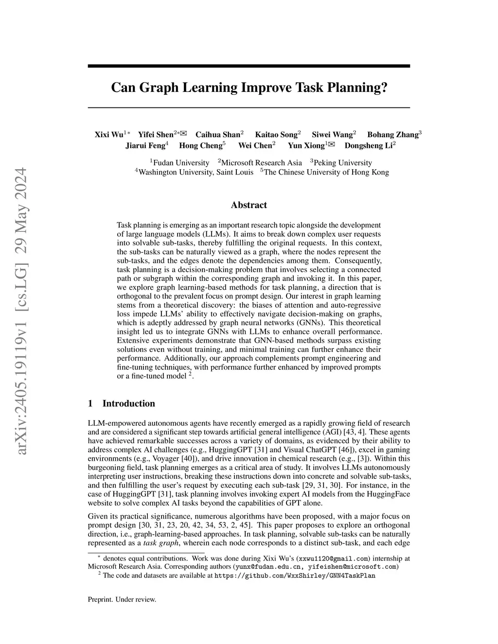 Task planning is emerging as an important research topic alongside the development of large language models (LLMs). It aims to break down complex user requests into solvable sub-tasks, thereby fulfilling the original requests. In this context, the sub-tasks can be naturally viewed as a graph, where the nodes represent the sub-tasks, and the edges denote the dependencies among them. Consequently, task planning is a decision-making problem that involves selecting a connected path or subgraph within the corresponding graph and invoking it. In this paper, we explore graph learning-based methods for task planning, a direction that is orthogonal to the prevalent focus on prompt design. Our interest in graph learning stems from a theoretical discovery: the biases of attention and auto-regressive loss impede LLMs' ability to effectively navigate decision-making on graphs, which is adeptly addressed by graph neural networks (GNNs). This theoretical insight led us to integrate GNNs with LLMs to enhance overall performance. Extensive experiments demonstrate that GNN-based methods surpass existing solutions even without training, and minimal training can further enhance their performance. Additionally, our approach complements prompt engineering and fine-tuning techniques, with performance further enhanced by improved prompts or a fine-tuned model.