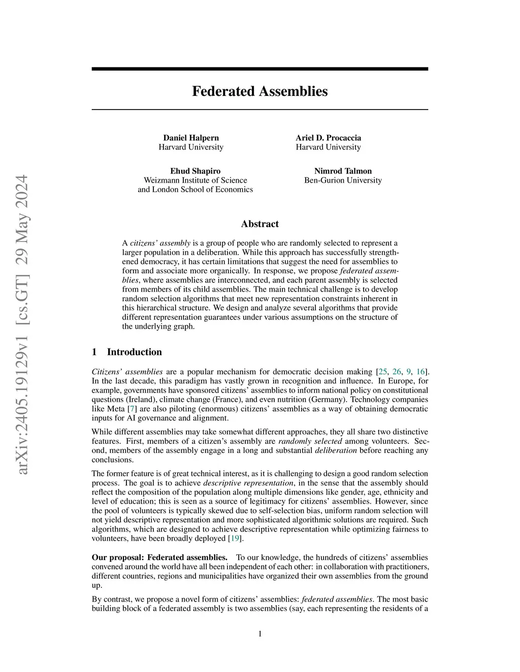 A citizens' assembly is a group of people who are randomly selected to represent a larger population in a deliberation. While this approach has successfully strengthened democracy, it has certain limitations that suggest the need for assemblies to form and associate more organically. In response, we propose federated assemblies, where assemblies are interconnected, and each parent assembly is selected from members of its child assemblies. The main technical challenge is to develop random selection algorithms that meet new representation constraints inherent in this hierarchical structure. We design and analyze several algorithms that provide different representation guarantees under various assumptions on the structure of the underlying graph.