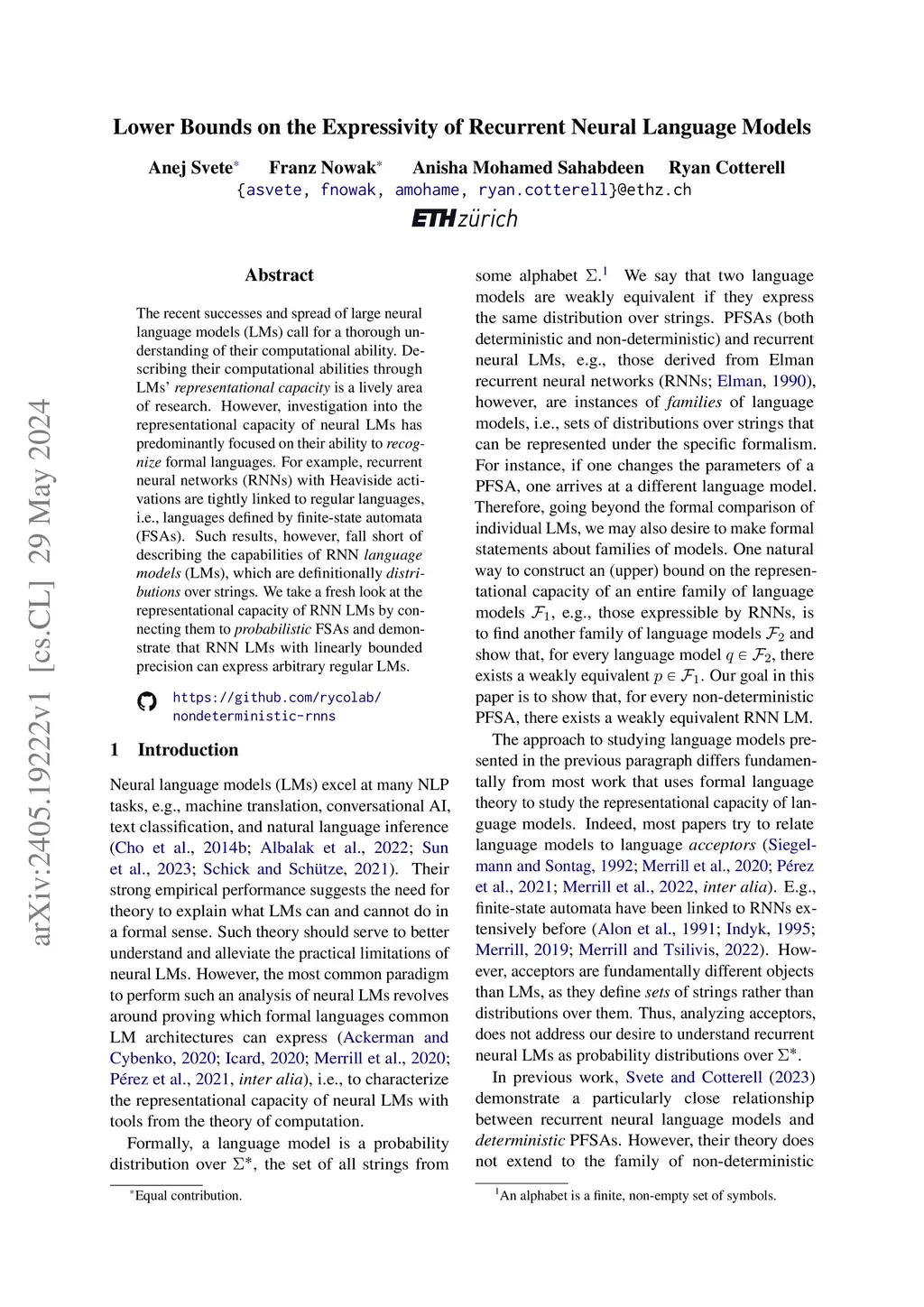 Lower Bounds on the Expressivity of Recurrent Neural Language Models