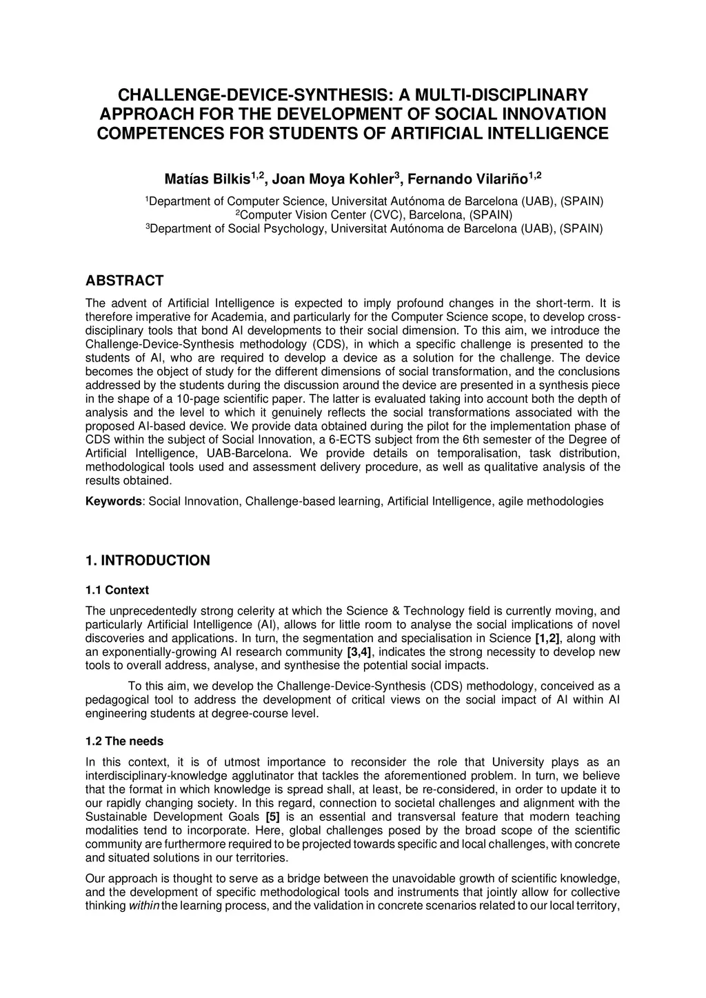 The advent of Artificial Intelligence is expected to imply profound changes in the short-term. It is therefore imperative for Academia, and particularly for the Computer Science scope, to develop cross-disciplinary tools that bond AI developments to their social dimension. To this aim, we introduce the Challenge-Device-Synthesis methodology (CDS), in which a specific challenge is presented to the students of AI, who are required to develop a device as a solution for the challenge. The device becomes the object of study for the different dimensions of social transformation, and the conclusions addressed by the students during the discussion around the device are presented in a synthesis piece in the shape of a 10-page scientific paper. The latter is evaluated taking into account both the depth of analysis and the level to which it genuinely reflects the social transformations associated with the proposed AI-based device. We provide data obtained during the pilot for the implementation phase of CDS within the subject of Social Innovation, a 6-ECTS subject from the 6th semester of the Degree of Artificial Intelligence, UAB-Barcelona. We provide details on temporalisation, task distribution, methodological tools used and assessment delivery procedure, as well as qualitative analysis of the results obtained.