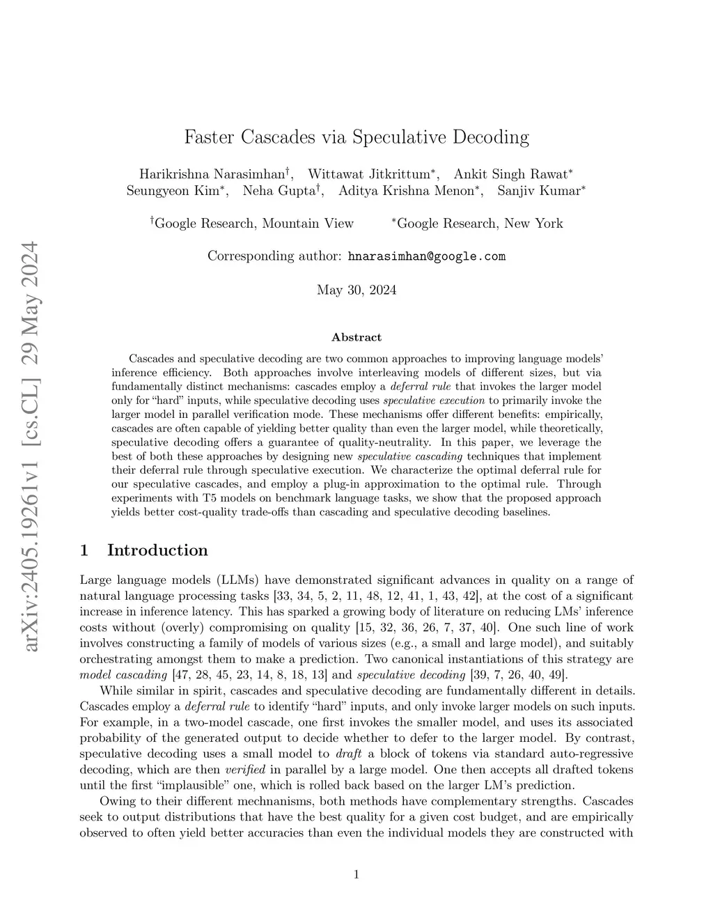 Cascades and speculative decoding are two common approaches to improving language models' inference efficiency. Both approaches involve interleaving models of different sizes, but via fundamentally distinct mechanisms: cascades employ a deferral rule that invokes the larger model only for "hard" inputs, while speculative decoding uses speculative execution to primarily invoke the larger model in parallel verification mode. These mechanisms offer different benefits: empirically, cascades are often capable of yielding better quality than even the larger model, while theoretically, speculative decoding offers a guarantee of quality-neutrality. In this paper, we leverage the best of both these approaches by designing new speculative cascading techniques that implement their deferral rule through speculative execution. We characterize the optimal deferral rule for our speculative cascades, and employ a plug-in approximation to the optimal rule. Through experiments with T5 models on benchmark language tasks, we show that the proposed approach yields better cost-quality trade-offs than cascading and speculative decoding baselines.