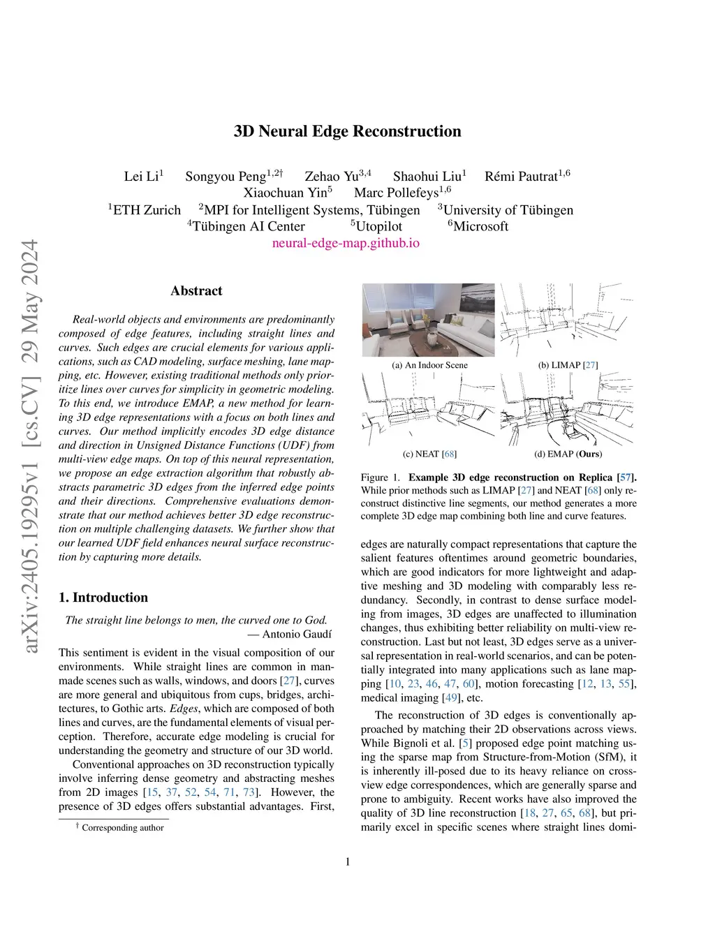 Real-world objects and environments are predominantly composed of edge features, including straight lines and curves. Such edges are crucial elements for various applications, such as CAD modeling, surface meshing, lane mapping, etc. However, existing traditional methods only prioritize lines over curves for simplicity in geometric modeling. To this end, we introduce EMAP, a new method for learning 3D edge representations with a focus on both lines and curves. Our method implicitly encodes 3D edge distance and direction in Unsigned Distance Functions (UDF) from multi-view edge maps. On top of this neural representation, we propose an edge extraction algorithm that robustly abstracts parametric 3D edges from the inferred edge points and their directions. Comprehensive evaluations demonstrate that our method achieves better 3D edge reconstruction on multiple challenging datasets. We further show that our learned UDF field enhances neural surface reconstruction by capturing more details.