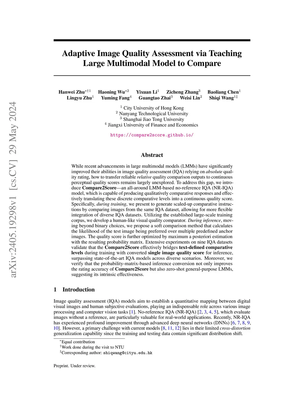 While recent advancements in large multimodal models (LMMs) have significantly improved their abilities in image quality assessment (IQA) relying on absolute quality rating, how to transfer reliable relative quality comparison outputs to continuous perceptual quality scores remains largely unexplored. To address this gap, we introduce Compare2Score-an all-around LMM-based no-reference IQA (NR-IQA) model, which is capable of producing qualitatively comparative responses and effectively translating these discrete comparative levels into a continuous quality score. Specifically, during training, we present to generate scaled-up comparative instructions by comparing images from the same IQA dataset, allowing for more flexible integration of diverse IQA datasets. Utilizing the established large-scale training corpus, we develop a human-like visual quality comparator. During inference, moving beyond binary choices, we propose a soft comparison method that calculates the likelihood of the test image being preferred over multiple predefined anchor images. The quality score is further optimized by maximum a posteriori estimation with the resulting probability matrix. Extensive experiments on nine IQA datasets validate that the Compare2Score effectively bridges text-defined comparative levels during training with converted single image quality score for inference, surpassing state-of-the-art IQA models across diverse scenarios. Moreover, we verify that the probability-matrix-based inference conversion not only improves the rating accuracy of Compare2Score but also zero-shot general-purpose LMMs, suggesting its intrinsic effectiveness.