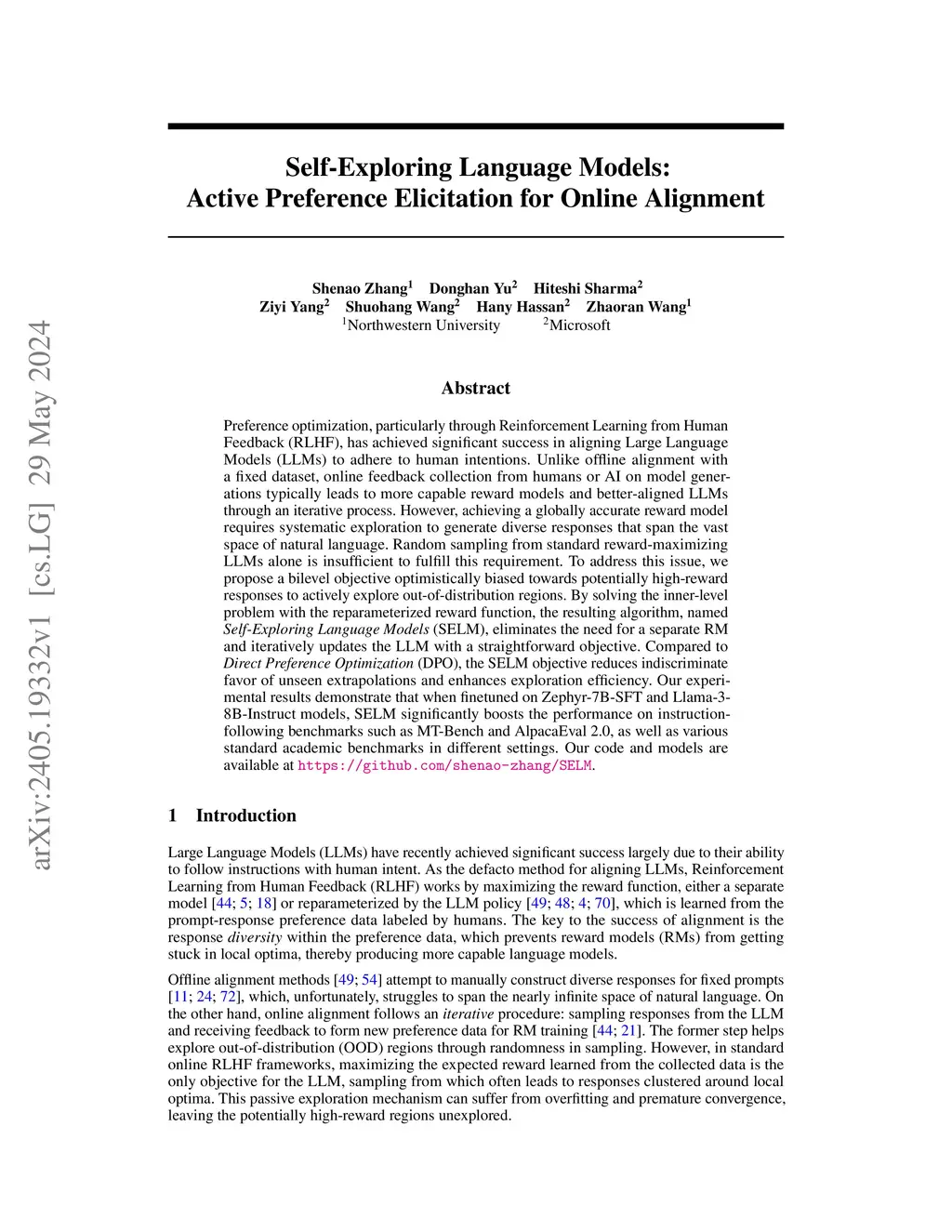 Preference optimization, particularly through Reinforcement Learning from Human Feedback (RLHF), has achieved significant success in aligning Large Language Models (LLMs) to adhere to human intentions. Unlike offline alignment with a fixed dataset, online feedback collection from humans or AI on model generations typically leads to more capable reward models and better-aligned LLMs through an iterative process. However, achieving a globally accurate reward model requires systematic exploration to generate diverse responses that span the vast space of natural language. Random sampling from standard reward-maximizing LLMs alone is insufficient to fulfill this requirement. To address this issue, we propose a bilevel objective optimistically biased towards potentially high-reward responses to actively explore out-of-distribution regions. By solving the inner-level problem with the reparameterized reward function, the resulting algorithm, named Self-Exploring Language Models (SELM), eliminates the need for a separate RM and iteratively updates the LLM with a straightforward objective. Compared to Direct Preference Optimization (DPO), the SELM objective reduces indiscriminate favor of unseen extrapolations and enhances exploration efficiency. Our experimental results demonstrate that when finetuned on Zephyr-7B-SFT and Llama-3-8B-Instruct models, SELM significantly boosts the performance on instruction-following benchmarks such as MT-Bench and AlpacaEval 2.0, as well as various standard academic benchmarks in different settings. Our code and models are available at https://github.com/shenao-zhang/SELM.