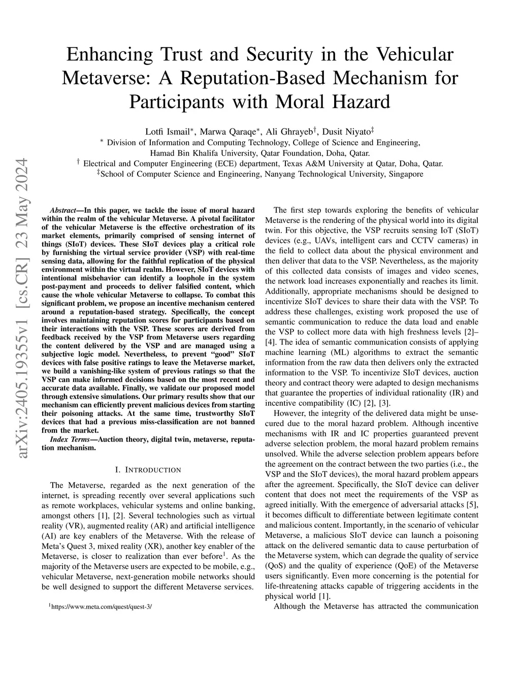 In this paper, we tackle the issue of moral hazard within the realm of the vehicular Metaverse. A pivotal facilitator of the vehicular Metaverse is the effective orchestration of its market elements, primarily comprised of sensing internet of things (SIoT) devices. These SIoT devices play a critical role by furnishing the virtual service provider (VSP) with real-time sensing data, allowing for the faithful replication of the physical environment within the virtual realm. However, SIoT devices with intentional misbehavior can identify a loophole in the system post-payment and proceeds to deliver falsified content, which cause the whole vehicular Metaverse to collapse. To combat this significant problem, we propose an incentive mechanism centered around a reputation-based strategy. Specifically, the concept involves maintaining reputation scores for participants based on their interactions with the VSP. These scores are derived from feedback received by the VSP from Metaverse users regarding the content delivered by the VSP and are managed using a subjective logic model. Nevertheless, to prevent ``good" SIoT devices with false positive ratings to leave the Metaverse market, we build a vanishing-like system of previous ratings so that the VSP can make informed decisions based on the most recent and accurate data available. Finally, we validate our proposed model through extensive simulations. Our primary results show that our mechanism can efficiently prevent malicious devices from starting their poisoning attacks. At the same time, trustworthy SIoT devices that had a previous miss-classification are not banned from the market.