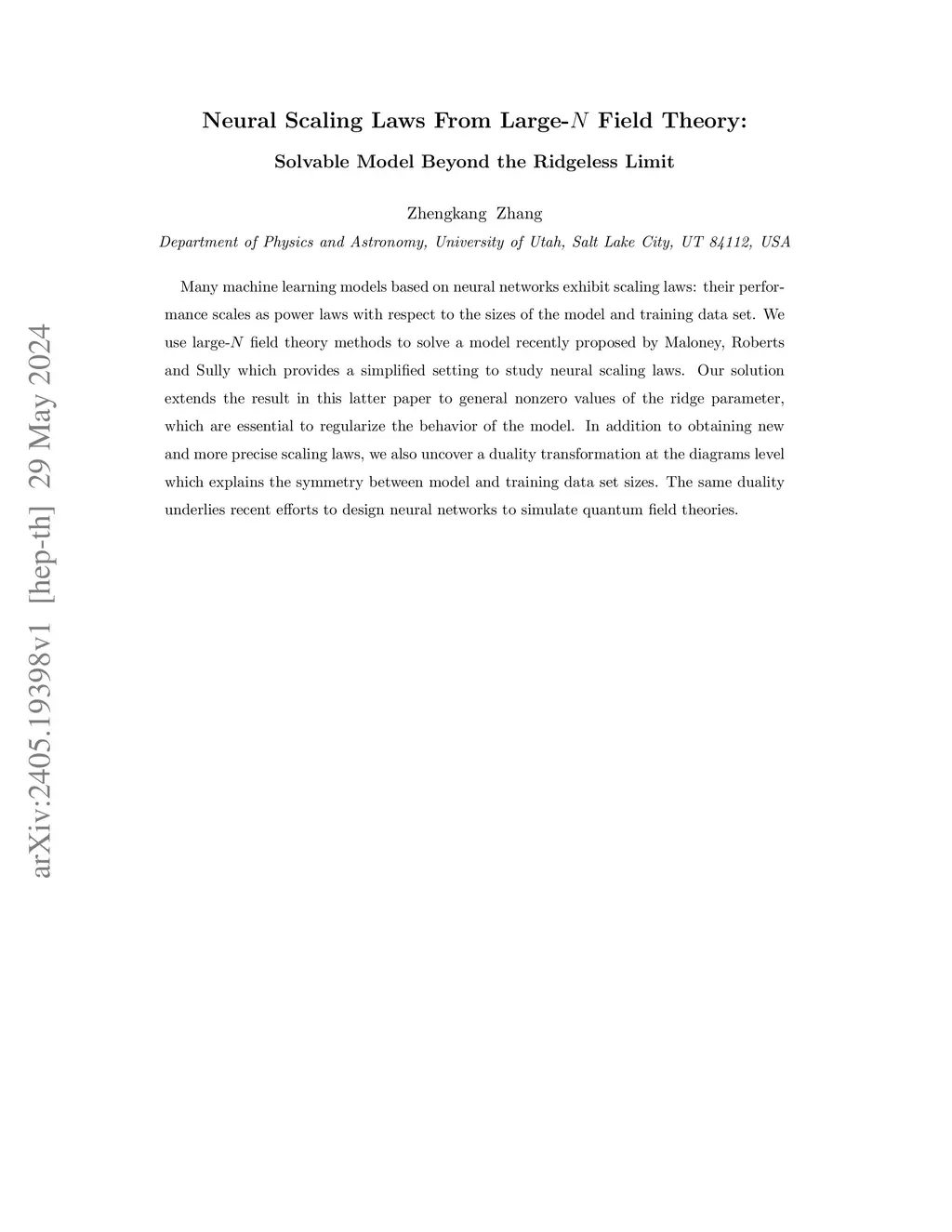 Many machine learning models based on neural networks exhibit scaling laws: their performance scales as power laws with respect to the sizes of the model and training data set. We use large-N field theory methods to solve a model recently proposed by Maloney, Roberts and Sully which provides a simplified setting to study neural scaling laws. Our solution extends the result in this latter paper to general nonzero values of the ridge parameter, which are essential to regularize the behavior of the model. In addition to obtaining new and more precise scaling laws, we also uncover a duality transformation at the diagrams level which explains the symmetry between model and training data set sizes. The same duality underlies recent efforts to design neural networks to simulate quantum field theories.