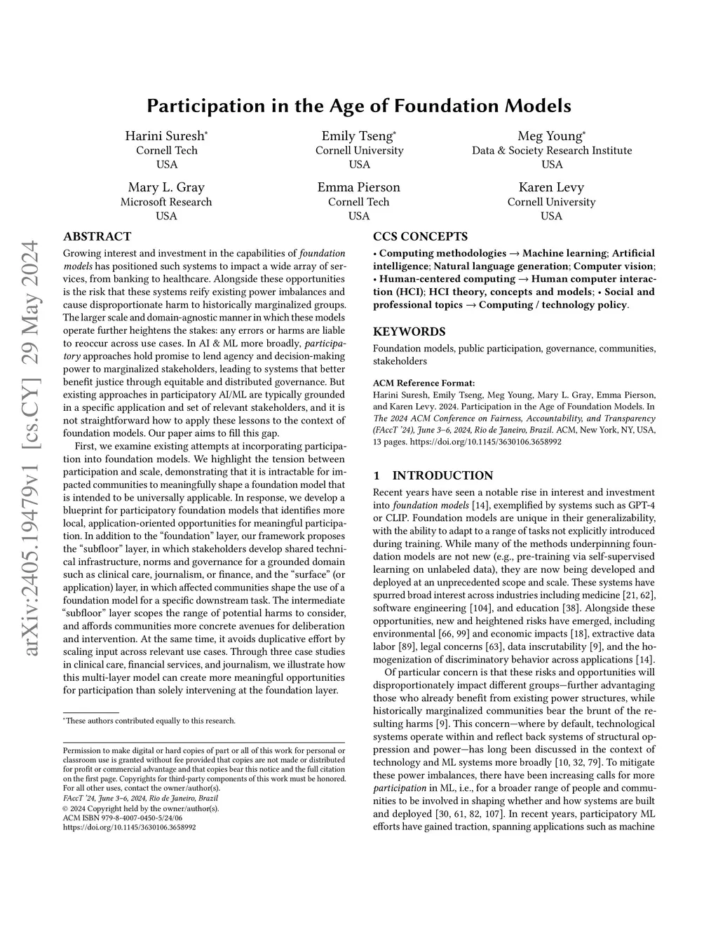 Growing interest and investment in the capabilities of foundation models has positioned such systems to impact a wide array of public services. Alongside these opportunities is the risk that these systems reify existing power imbalances and cause disproportionate harm to marginalized communities. Participatory approaches hold promise to instead lend agency and decision-making power to marginalized stakeholders. But existing approaches in participatory AI/ML are typically deeply grounded in context - how do we apply these approaches to foundation models, which are, by design, disconnected from context? Our paper interrogates this question. First, we examine existing attempts at incorporating participation into foundation models. We highlight the tension between participation and scale, demonstrating that it is intractable for impacted communities to meaningfully shape a foundation model that is intended to be universally applicable. In response, we develop a blueprint for participatory foundation models that identifies more local, application-oriented opportunities for meaningful participation. In addition to the "foundation" layer, our framework proposes the "subfloor'' layer, in which stakeholders develop shared technical infrastructure, norms and governance for a grounded domain, and the "surface'' layer, in which affected communities shape the use of a foundation model for a specific downstream task. The intermediate "subfloor'' layer scopes the range of potential harms to consider, and affords communities more concrete avenues for deliberation and intervention. At the same time, it avoids duplicative effort by scaling input across relevant use cases. Through three case studies in clinical care, financial services, and journalism, we illustrate how this multi-layer model can create more meaningful opportunities for participation than solely intervening at the foundation layer.