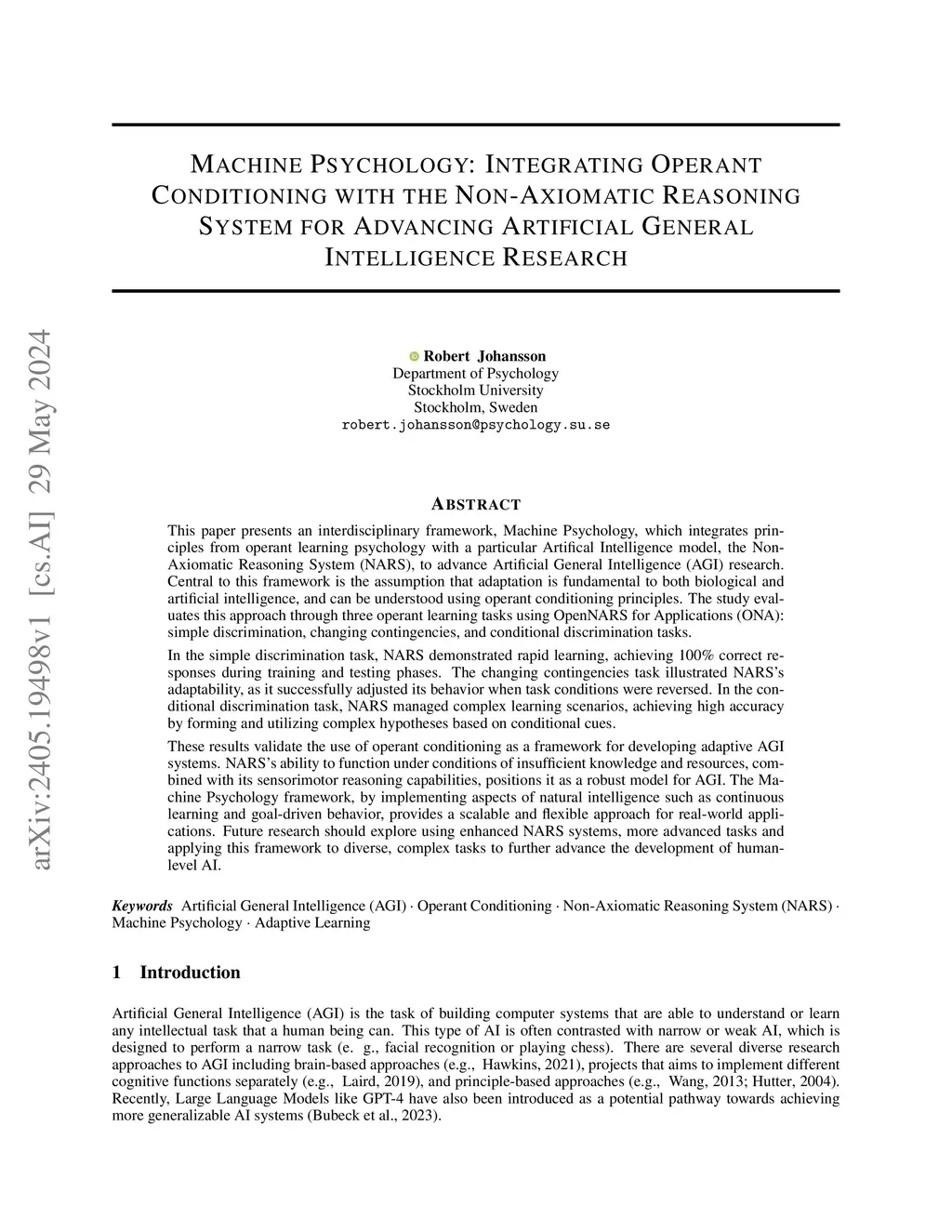 This paper introduces an interdisciplinary framework called Machine Psychology, which merges principles from operant learning psychology with a specific Artificial Intelligence model, the Non-Axiomatic Reasoning System (NARS), to enhance Artificial General Intelligence (AGI) research. The core premise of this framework is that adaptation is crucial to both biological and artificial intelligence and can be understood through operant conditioning principles. The study assesses this approach via three operant learning tasks using OpenNARS for Applications (ONA): simple discrimination, changing contingencies, and conditional discrimination tasks. In the simple discrimination task, NARS demonstrated rapid learning, achieving perfect accuracy during both training and testing phases. The changing contingencies task showcased NARS's adaptability, as it successfully adjusted its behavior when task conditions were reversed. In the conditional discrimination task, NARS handled complex learning scenarios effectively, achieving high accuracy by forming and utilizing intricate hypotheses based on conditional cues. These findings support the application of operant conditioning as a framework for creating adaptive AGI systems. NARS's ability to operate under conditions of insufficient knowledge and resources, coupled with its sensorimotor reasoning capabilities, establishes it as a robust model for AGI. The Machine Psychology framework, by incorporating elements of natural intelligence such as continuous learning and goal-driven behavior, offers a scalable and flexible approach for real-world applications. Future research should investigate using enhanced NARS systems, more advanced tasks, and applying this framework to diverse, complex challenges to further progress the development of human-level AI.