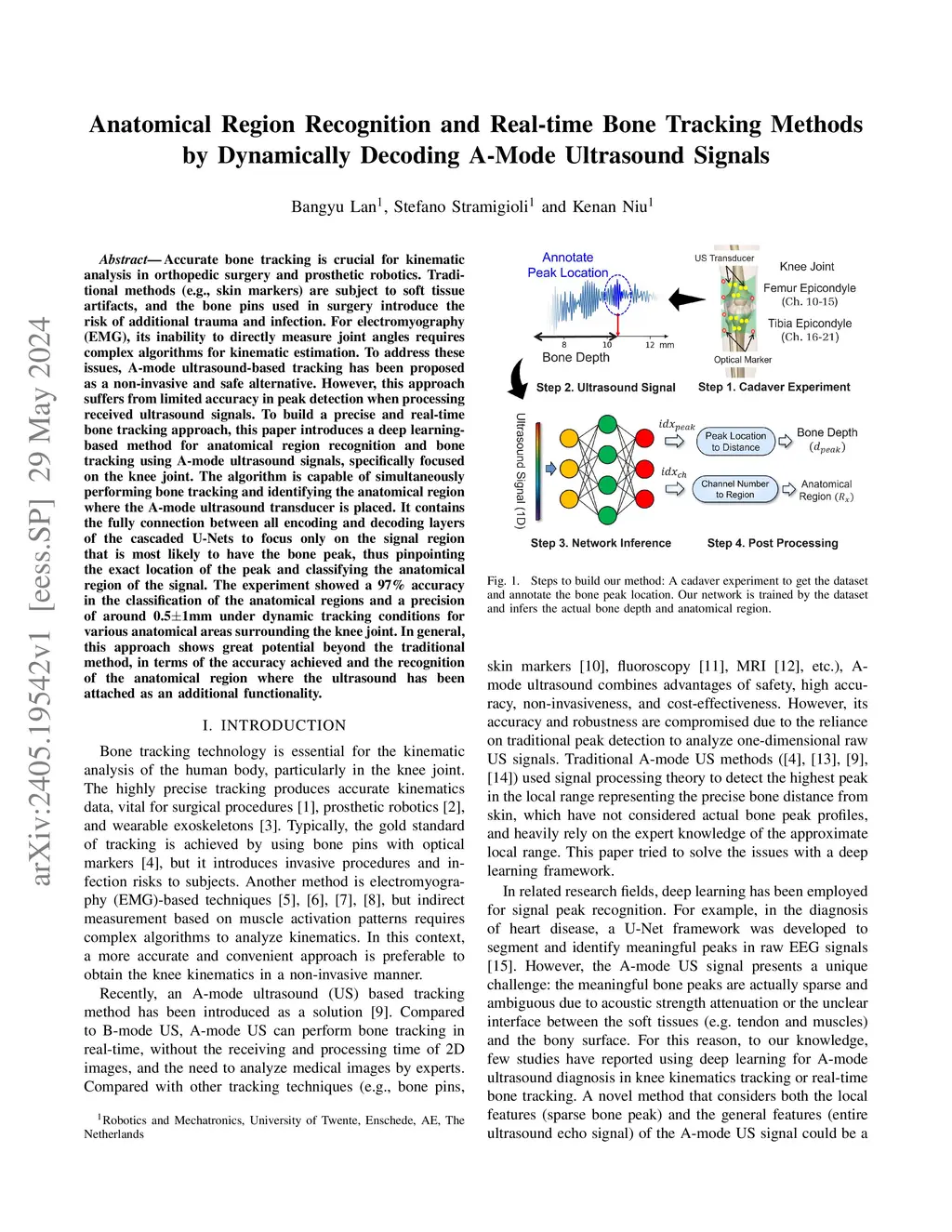 Accurate bone tracking is crucial for kinematic analysis in orthopedic surgery and prosthetic robotics. Traditional methods (e.g., skin markers) are subject to soft tissue artifacts, and the bone pins used in surgery introduce the risk of additional trauma and infection. For electromyography (EMG), its inability to directly measure joint angles requires complex algorithms for kinematic estimation. To address these issues, A-mode ultrasound-based tracking has been proposed as a non-invasive and safe alternative. However, this approach suffers from limited accuracy in peak detection when processing received ultrasound signals. To build a precise and real-time bone tracking approach, this paper introduces a deep learning-based method for anatomical region recognition and bone tracking using A-mode ultrasound signals, specifically focused on the knee joint. The algorithm is capable of simultaneously performing bone tracking and identifying the anatomical region where the A-mode ultrasound transducer is placed. It contains the fully connection between all encoding and decoding layers of the cascaded U-Nets to focus only on the signal region that is most likely to have the bone peak, thus pinpointing the exact location of the peak and classifying the anatomical region of the signal. The experiment showed a 97% accuracy in the classification of the anatomical regions and a precision of around 0.51mm under dynamic tracking conditions for various anatomical areas surrounding the knee joint. In general, this approach shows great potential beyond the traditional method, in terms of the accuracy achieved and the recognition of the anatomical region where the ultrasound has been attached as an additional functionality.