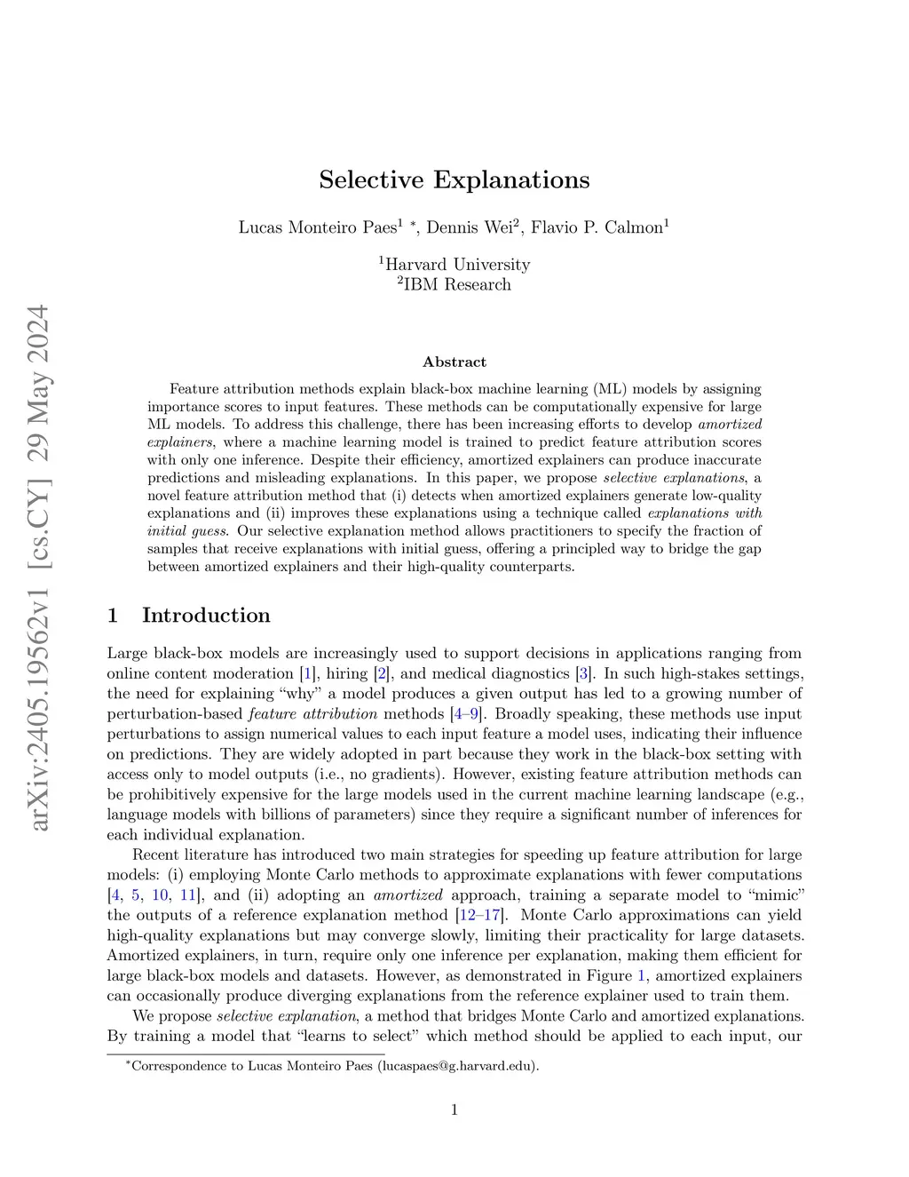 Feature attribution methods explain black-box machine learning (ML) models by assigning importance scores to input features. These methods can be computationally expensive for large ML models. To address this challenge, there has been increasing efforts to develop amortized explainers, where a machine learning model is trained to predict feature attribution scores with only one inference. Despite their efficiency, amortized explainers can produce inaccurate predictions and misleading explanations. In this paper, we propose selective explanations, a novel feature attribution method that (i) detects when amortized explainers generate low-quality explanations and (ii) improves these explanations using a technique called explanations with initial guess. Our selective explanation method allows practitioners to specify the fraction of samples that receive explanations with initial guess, offering a principled way to bridge the gap between amortized explainers and their high-quality counterparts.