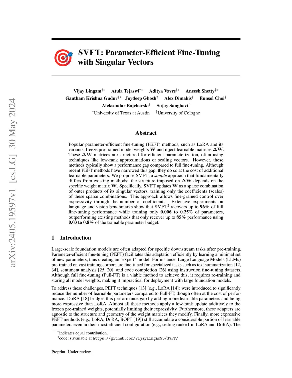 Popular parameter-efficient fine-tuning (PEFT) methods, such as LoRA and its variants, freeze pre-trained model weights \(W\) and inject learnable matrices \(\Delta W\). These \(\Delta W\) matrices are structured for efficient parameterization, often using techniques like low-rank approximations or scaling vectors. However, these methods typically show a performance gap compared to full fine-tuning. Although recent PEFT methods have narrowed this gap, they do so at the cost of additional learnable parameters. We propose SVFT, a simple approach that fundamentally differs from existing methods: the structure imposed on \(\Delta W\) depends on the specific weight matrix \(W\). Specifically, SVFT updates \(W\) as a sparse combination of outer products of its singular vectors, training only the coefficients (scales) of these sparse combinations. This approach allows fine-grained control over expressivity through the number of coefficients. Extensive experiments on language and vision benchmarks show that SVFT recovers up to 96% of full fine-tuning performance while training only 0.006 to 0.25% of parameters, outperforming existing methods that only recover up to 85% performance using 0.03 to 0.8% of the trainable parameter budget.