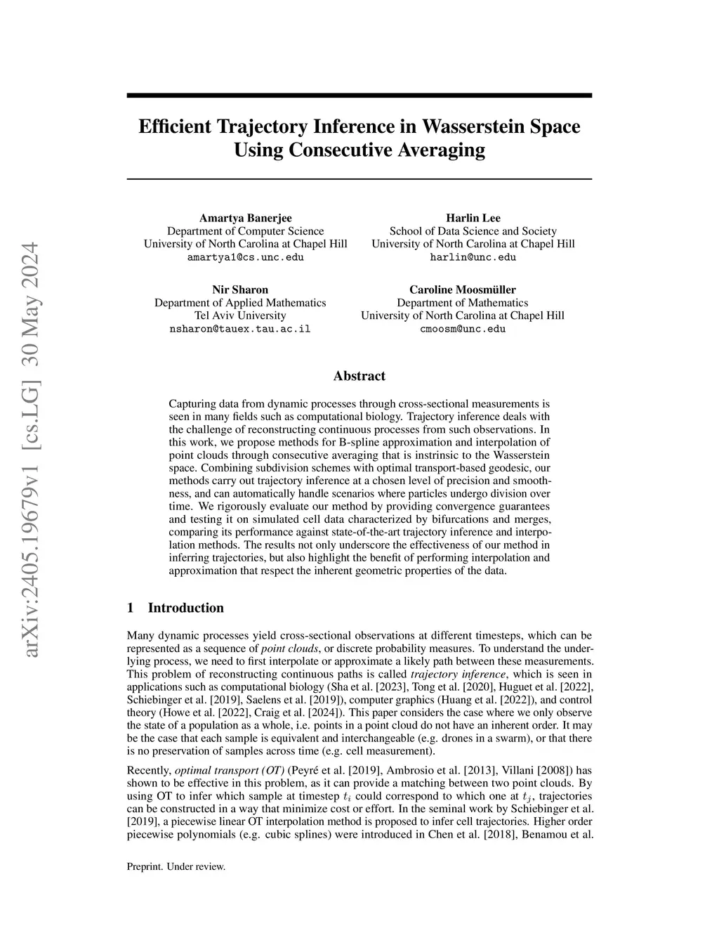Capturing data from dynamic processes through cross-sectional measurements is seen in many fields, such as computational biology. Trajectory inference deals with the challenge of reconstructing continuous processes from such observations. In this work, we propose methods for B-spline approximation and interpolation of point clouds through consecutive averaging that is intrinsic to the Wasserstein space. Combining subdivision schemes with optimal transport-based geodesic, our methods carry out trajectory inference at a chosen level of precision and smoothness, and can automatically handle scenarios where particles undergo division over time. We prove linear convergence rates and rigorously evaluate our method on cell data characterized by bifurcations, merges, and trajectory splitting scenarios like , comparing its performance against state-of-the-art trajectory inference and interpolation methods. The results not only underscore the effectiveness of our method in inferring trajectories but also highlight the benefit of performing interpolation and approximation that respect the inherent geometric properties of the data.