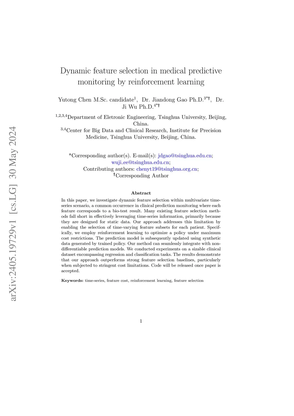 In this paper, we investigate dynamic feature selection within multivariate time-series scenario, a common occurrence in clinical prediction monitoring where each feature corresponds to a bio-test result. Many existing feature selection methods fall short in effectively leveraging time-series information, primarily because they are designed for static data. Our approach addresses this limitation by enabling the selection of time-varying feature subsets for each patient. Specifically, we employ reinforcement learning to optimize a policy under maximum cost restrictions. The prediction model is subsequently updated using synthetic data generated by trained policy. Our method can seamlessly integrate with non-differentiable prediction models. We conducted experiments on a sizable clinical dataset encompassing regression and classification tasks. The results demonstrate that our approach outperforms strong feature selection baselines, particularly when subjected to stringent cost limitations. Code will be released once paper is accepted.