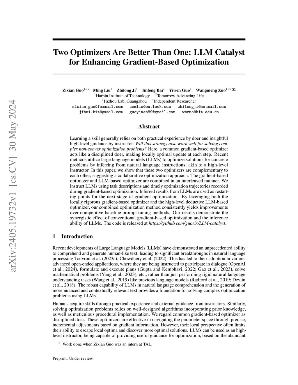 Learning a skill generally relies on both practical experience by doer and insightful high-level guidance by instructor. Will this strategy also work well for solving complex non-convex optimization problems? Here, a common gradient-based optimizer acts like a disciplined doer, making locally optimal update at each step. Recent methods utilize large language models (LLMs) to optimize solutions for concrete problems by inferring from natural language instructions, akin to a high-level instructor. In this paper, we show that these two optimizers are complementary to each other, suggesting a collaborative optimization approach. The gradient-based optimizer and LLM-based optimizer are combined in an interleaved manner. We instruct LLMs using task descriptions and timely optimization trajectories recorded during gradient-based optimization. Inferred results from LLMs are used as restarting points for the next stage of gradient optimization. By leveraging both the locally rigorous gradient-based optimizer and the high-level deductive LLM-based optimizer, our combined optimization method consistently yields improvements over competitive baseline prompt tuning methods. Our results demonstrate the synergistic effect of conventional gradient-based optimization and the inference ability of LLMs. The code is released at https://github.com/guozix/LLM-catalyst.