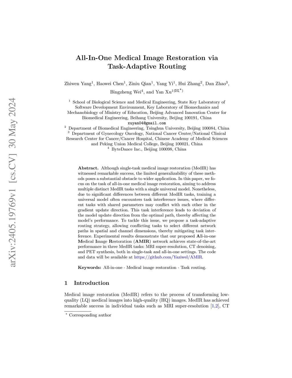 Although single-task medical image restoration (MedIR) has witnessed remarkable success, the limited generalizability of these methods poses a substantial obstacle to wider application. In this paper, we focus on the task of all-in-one medical image restoration, aiming to address multiple distinct MedIR tasks with a single universal model. Nonetheless, due to significant differences between different MedIR tasks, training a universal model often encounters task interference issues, where different tasks with shared parameters may conflict with each other in the gradient update direction. This task interference leads to deviation of the model update direction from the optimal path, thereby affecting the model's performance. To tackle this issue, we propose a task-adaptive routing strategy, allowing conflicting tasks to select different network paths in spatial and channel dimensions, thereby mitigating task interference. Experimental results demonstrate that our proposed \textbf{A}ll-in-one \textbf{M}edical \textbf{I}mage \textbf{R}estoration (\textbf{AMIR}) network achieves state-of-the-art performance in three MedIR tasks: MRI super-resolution, CT denoising, and PET synthesis, both in single-task and all-in-one settings. The code and data will be available at \href{https://github.com/Yaziwel/All-In-One-Medical-Image-Restoration-via-Task-Adaptive-Routing.git}{https://github.com/Yaziwel/AMIR}.