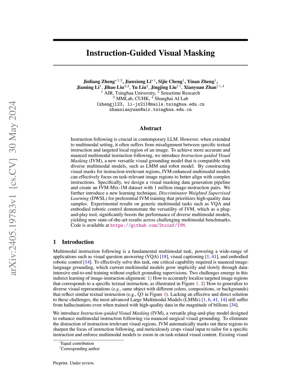 Instruction following is crucial in contemporary LLM. However, when extended to multimodal setting, it often suffers from misalignment between specific textual instruction and targeted local region of an image. To achieve more accurate and nuanced multimodal instruction following, we introduce Instruction-guided Visual Masking (IVM), a new versatile visual grounding model that is compatible with diverse multimodal models, such as LMM and robot model. By constructing visual masks for instruction-irrelevant regions, IVM-enhanced multimodal models can effectively focus on task-relevant image regions to better align with complex instructions. Specifically, we design a visual masking data generation pipeline and create an IVM-Mix-1M dataset with 1 million image-instruction pairs. We further introduce a new learning technique, Discriminator Weighted Supervised Learning (DWSL) for preferential IVM training that prioritizes high-quality data samples. Experimental results on generic multimodal tasks such as VQA and embodied robotic control demonstrate the versatility of IVM, which as a plug-and-play tool, significantly boosts the performance of diverse multimodal models, yielding new state-of-the-art results across challenging multimodal benchmarks. Code is available at https://github.com/2toinf/IVM.