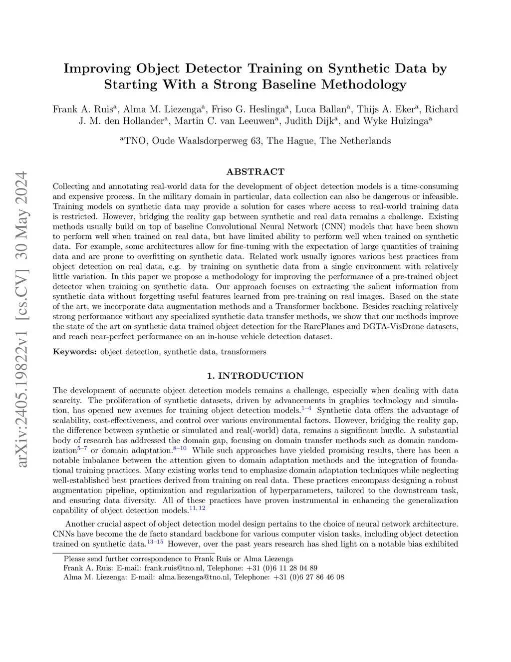 Collecting and annotating real-world data for the development of object detection models is a time-consuming and expensive process. In the military domain in particular, data collection can also be dangerous or infeasible. Training models on synthetic data may provide a solution for cases where access to real-world training data is restricted. However, bridging the reality gap between synthetic and real data remains a challenge. Existing methods usually build on top of baseline Convolutional Neural Network (CNN) models that have been shown to perform well when trained on real data, but have limited ability to perform well when trained on synthetic data. For example, some architectures allow for fine-tuning with the expectation of large quantities of training data and are prone to overfitting on synthetic data. Related work usually ignores various best practices from object detection on real data, e.g. by training on synthetic data from a single environment with relatively little variation. In this paper we propose a methodology for improving the performance of a pre-trained object detector when training on synthetic data. Our approach focuses on extracting the salient information from synthetic data without forgetting useful features learned from pre-training on real images. Based on the state of the art, we incorporate data augmentation methods and a Transformer backbone. Besides reaching relatively strong performance without any specialized synthetic data transfer methods, we show that our methods improve the state of the art on synthetic data trained object detection for the RarePlanes and DGTA-VisDrone datasets, and reach near-perfect performance on an in-house vehicle detection dataset.