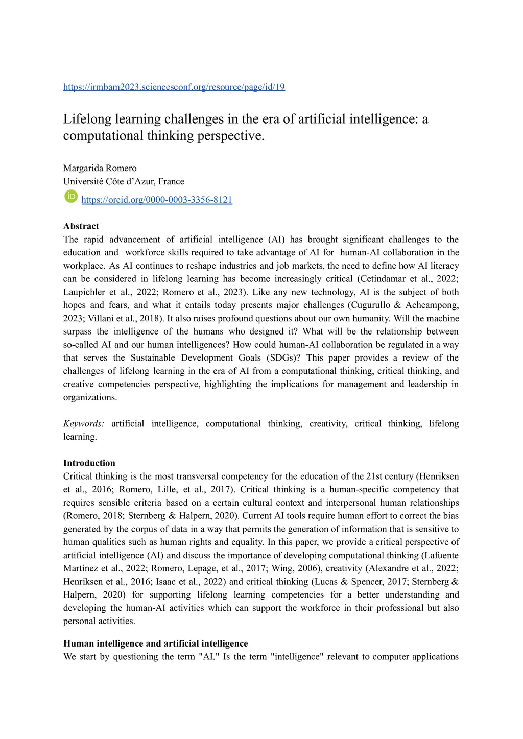The rapid advancement of artificial intelligence (AI) has brought significant challenges to the education and workforce skills required to take advantage of AI for human-AI collaboration in the workplace. As AI continues to reshape industries and job markets, the need to define how AI literacy can be considered in lifelong learning has become increasingly critical (Cetindamar et al., 2022; Laupichler et al., 2022; Romero et al., 2023). Like any new technology, AI is the subject of both hopes and fears, and what it entails today presents major challenges (Cugurullo \& Acheampong, 2023; Villani et al., 2018). It also raises profound questions about our own humanity. Will the machine surpass the intelligence of the humans who designed it? What will be the relationship between so-called AI and our human intelligences? How could human-AI collaboration be regulated in a way that serves the Sustainable Development Goals (SDGs)? This paper provides a review of the challenges of lifelong learning in the era of AI from a computational thinking, critical thinking, and creative competencies perspective, highlighting the implications for management and leadership in organizations.